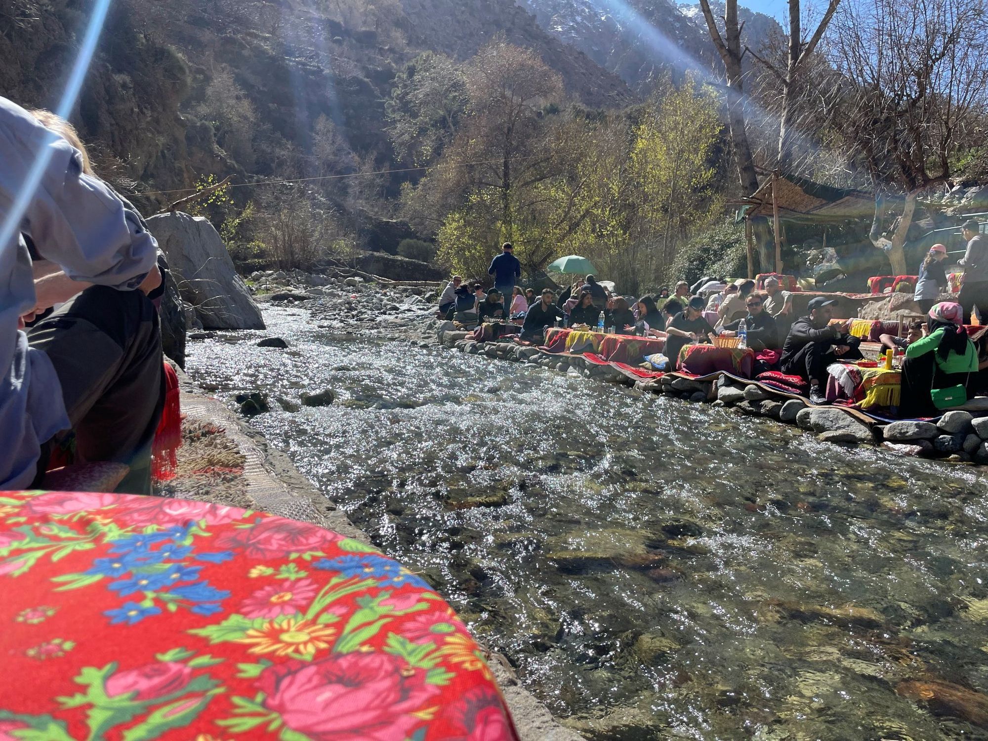 - We paid €12.00 per person and while the food itself is perfectly acceptable, the highlight is the dining experience. Sitting on low cushions beside the flowing river, with the Atlas Mountains framing the background, is pretty spectacular.