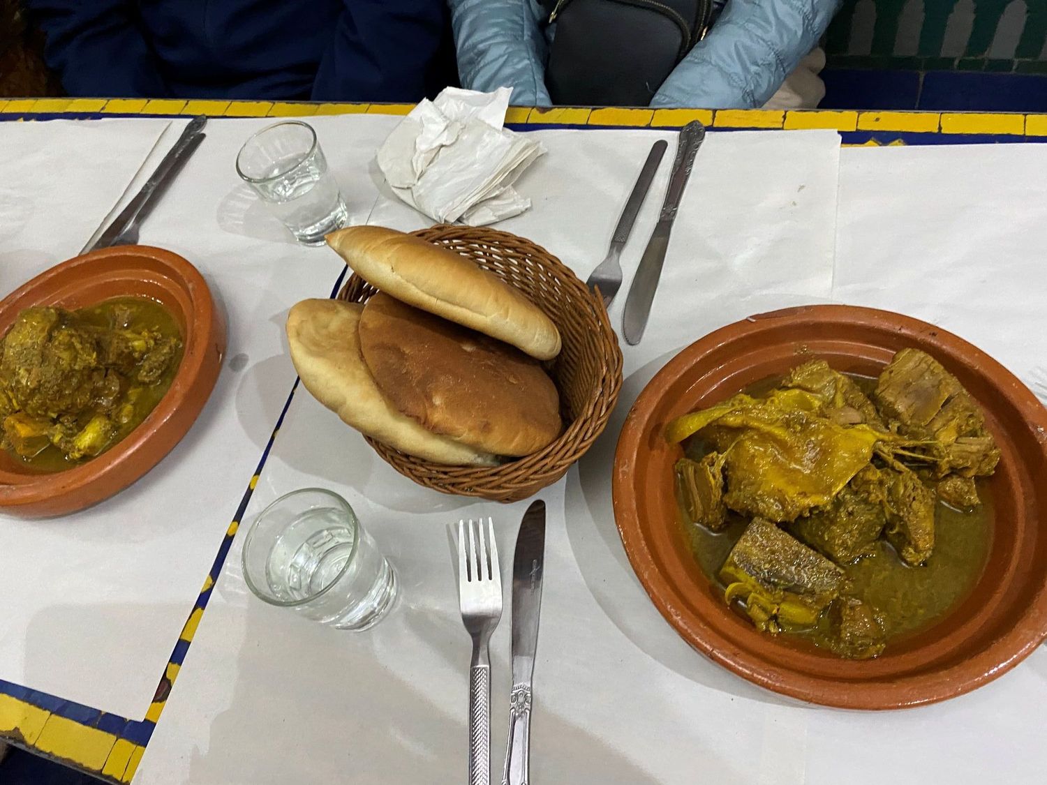 - Choosing à la carte, we started with bowls of Harira Soup and then shared a very generous assortment of Moroccan Salads and Briwat, Chicken Tajine, and a bottle of local white wine. More than enough for the two of us and a very reasonable €65.00.