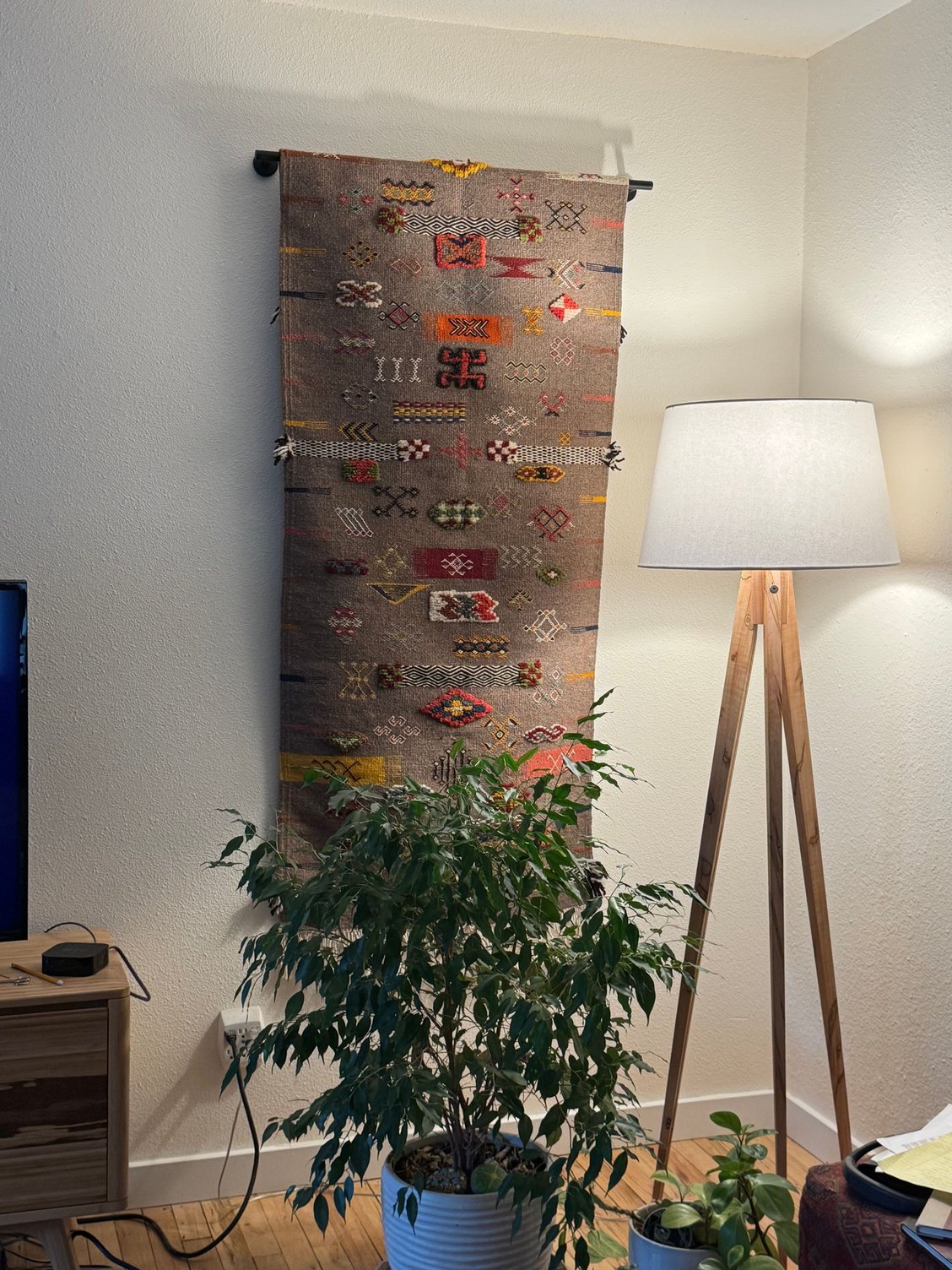you can see the rug we bought hanging over the rail in the upper left hand corner. Part of it is tufted, so not really practical to be on the floor. many of the rugs are of course meant to be used as, well, rugs!! others, like this one are really works of art.