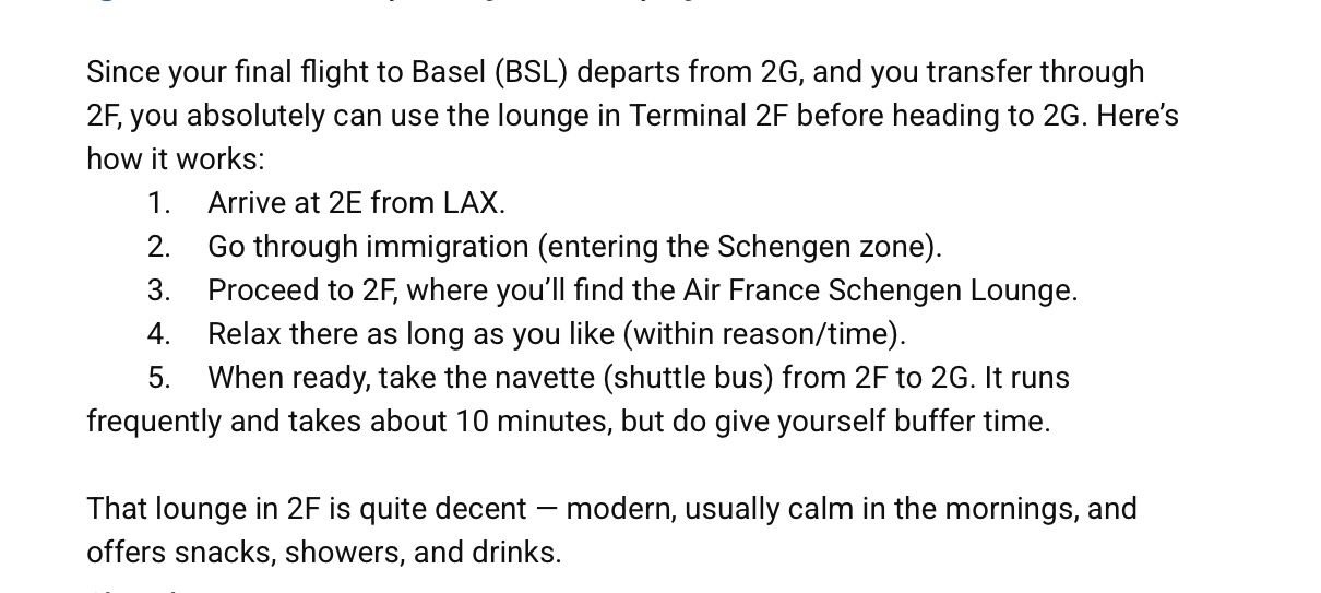 “If you're arriving at 2E (K, L, or M gates) from LAX and connecting to Basel (BSL) via 2F, you will have to go through immigration upon arrival, because you re entering the Schengen Area at CDG. Once you go through passport control and move toward 2F for your connecting flight, you won't be able to go back to the 2E gates or lounges, because they are in the non-Schengen zone.
