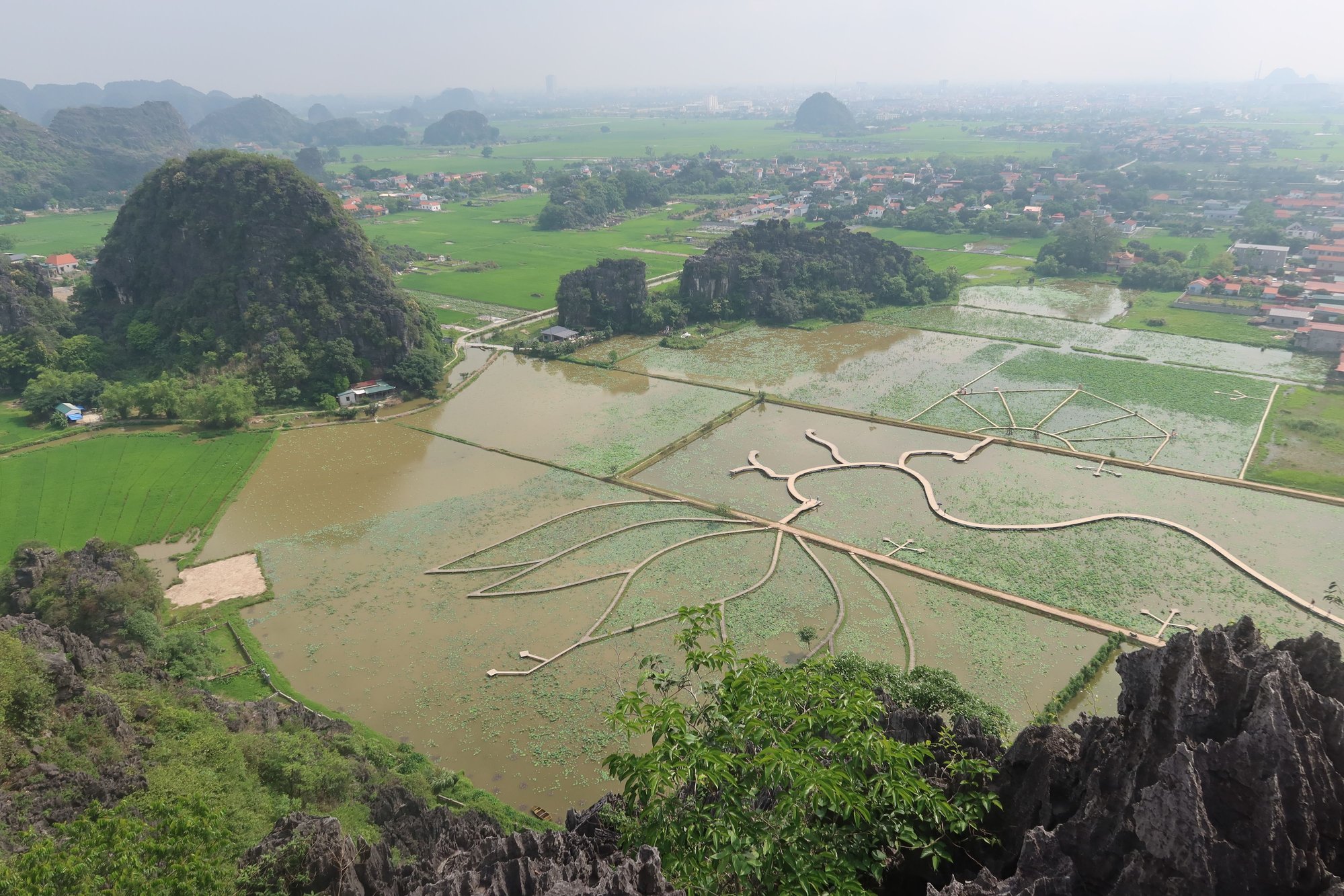 Today was a very full day in Ninh Binh. We ate a good breakfast at our hotel at 6:30 AM and were out the door by 7:30 AM. We began our day at Mua Caves. In spite of the name of the site, the attraction is above ground. We enjoyed a leisurely walk along the boardwalks of the lotus garden, taking in the incredible scenery of limestone cliffs all around us. From there we ascended one of the mountains, hiking all the way up to the top with a pagoda in honor of Quan Am and a dragon god. We savored the picturebook perfect views of mountains that looked like it was lifted out of a classical Chinese or Vietnamese landscape painting, large valleys dotted with rice paddies all around us, and temples and pagodas peeking out like exclamation points. After some time at the top we descended to a saddle and then hiked up to another high point for more views. While the hike was not difficult (about 500 steps in all), it was somewhat exhausting as the humidity was intense. As a matter of fact, the humidity (in the 80% and 90% range) has been intensive every day we've been north of the DMZ.