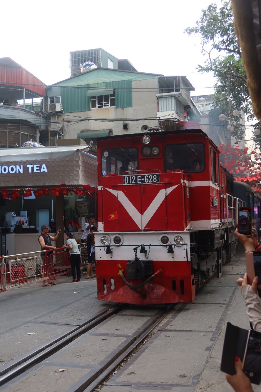 We then walked over to the social media-made-famous Train Street, where cafes line both sides of the railroad tracks. We had not intended to visit Train Street, but passed by it on the way from the Citadel to Hoa Lo Prison and thought why not. Walking up the street we saw a throng of tourists posing for photos on the tracks and the cafes buzzing with visitors. We casually asked one of the hustlers trying to lure visitors into their cafe and asked if there was a train expected to pass soon. She said yes, in 15 minutes. We walked up another half a block, saw empty seats, sat down, ordered beverages, and waited for the action. About five minutes later, the alarm sounded and the train whizzed by.
