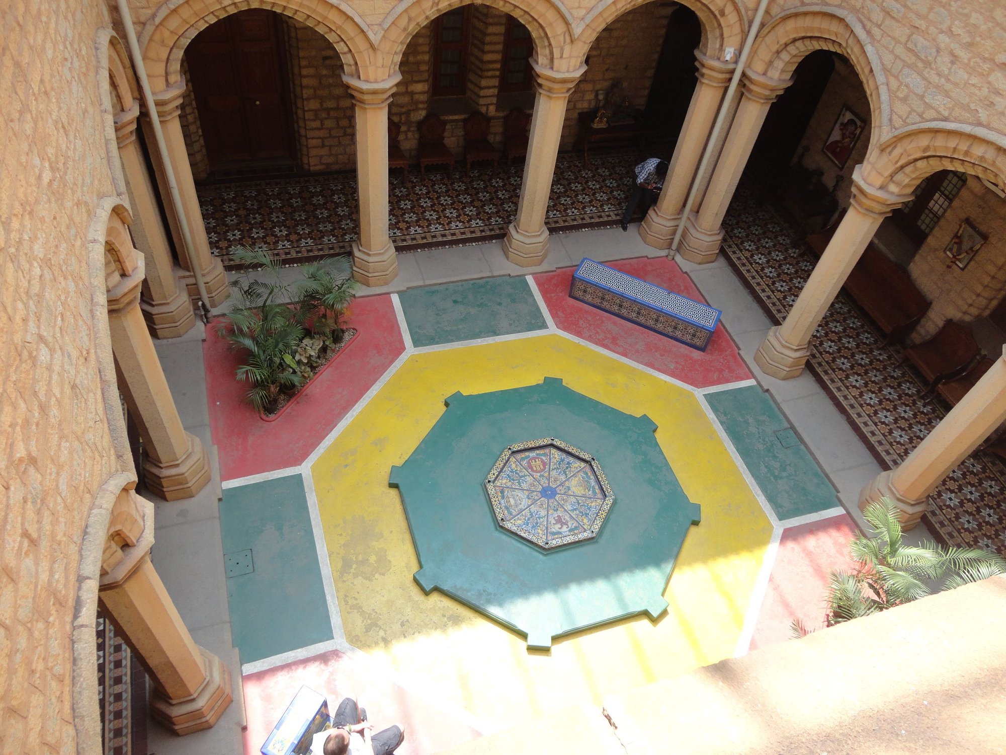 Courtyard tiled in Spanish Moorish style. The seats were tiled in Spanish tiles given by the Spanish King of the time.