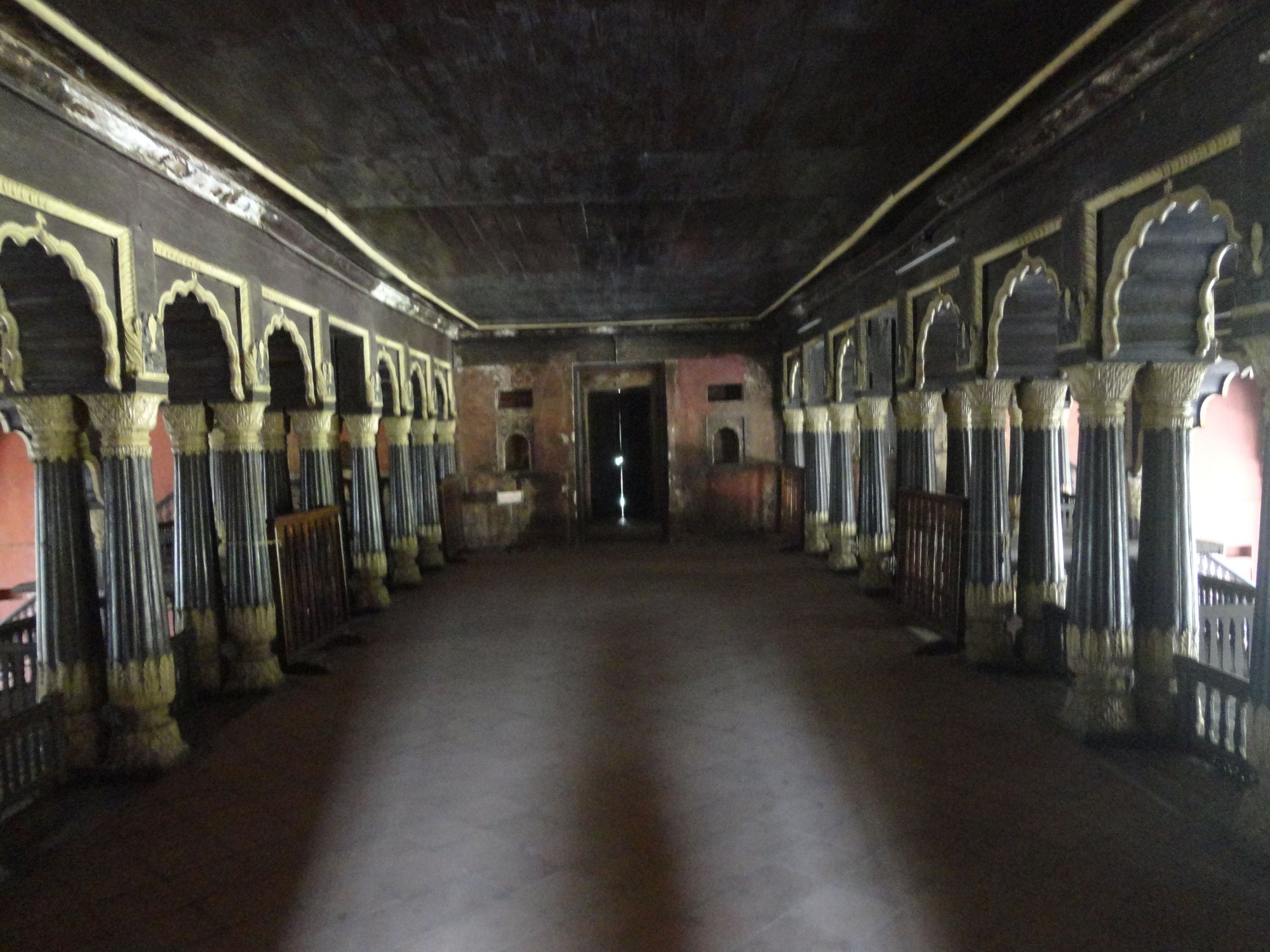 A trip to Tipu Sultan’s Palace - Albert Victor Road - ₹15/200 camera ₹25 - 8.30 – 5.30. The tickets to the Tipu Sultan’s Palace are also much cheaper than to Bangalore Palace – ₹10 for Indians and ₹100 for foreigners. 3 km from Bangalore City Railway Station, Tipu's Summer Palace is near the Fort at Albert Victor Road. It is an Indo-Islamic building and an important landmark in Bangalore. This was used as a summer retreat by the Sultan, who called it the Rash-e-Jannat meaning Envy of Heven. Hyder Ali, his father, started the palace within the walls of the Bangalore Fort and it was completed by Tipu Sultan in 1791. The structure is similar to the Daria Daulat palace in Sirirangapatnam. After Tipu Sultan's death in the Fourth Anglo-Mysore War, the British Administration used the palace for its Secretariat before moving to Attara Kacheri in 1868. The entire two storied palace is built of teak wood, mortar, stone and plaster laid on a stone plinth. The carved pillars support giant wooden beams It is quite dark and so difficult to see many of the carvings.. Tipu Sultan used to conduct his durbar (audiences) from the upper floor of the palace. The upper chambers and balconies are accessed by four staircases with the central portion being a large hall that leads to four smaller rooms. - the women's quarters. The balcony at the rear was used by the queen. Beautiful floral motifs enhance the walls and the ceilings of the palace. The palace houses a small museum showcasing various achievements of Tipu Sultan and his administration, together with historical photos and artefacts of Hyder Ali, Tipu Sultan and other famous personalities. There is a replica of Tipu's Tiger, which is in the Victoria and Albert Museum in London. Tipu Sultan's clothes and his crown are displayed on silver and gold pedestals - large - reminds me of Henry's VIII's clothes.. There is a painting of the throne visualized by Tipu Sultan - coated with gold sheets and covered with emeralds,. Tipu vowed never to use it until he completely defeated the English Army. After Tipu Sultan's death, the British dismantled the throne and auctioned its parts. Photography is allowed and there is no special fee for camera. Open: 10 AM to 6 PM Monday to Saturday. Closed on Sundays.