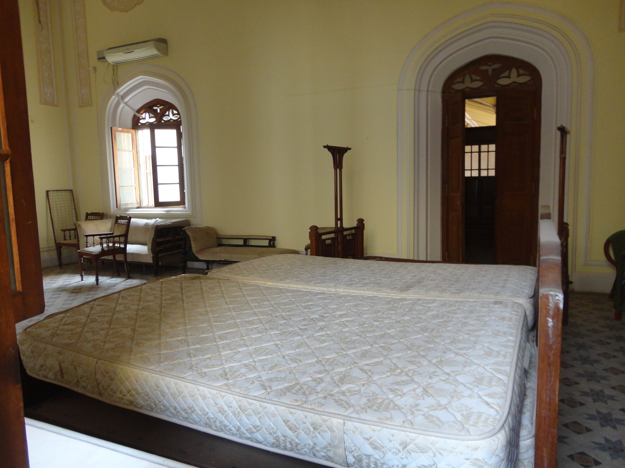 Our intended walks around Bangalore with Unhurried Tours, Bangalore Walks etc were shelved. Our Tuk Tuk driver met us after breakfast after he had done the morning school run, and took us to Bangalore Palace – Palace Road Vasant Nagar. The Bangalore Palace was for many years closed to tourists. The palace was originally Rev. Garrett’s home. In 1873, it was bought by Maharaja Chamarajendra Wadiyar. The palace has fortified towers, Gothic windows, battlements and turrets. The palace is mainly constructed of wood and is famous for its carvings and paintings. Built to resemble the Windsor Castle in England, it is the seat of the current Maharajah of Mysore, and head of the royal Wodeyar dynasty. Inside, are lavish interiors and a surprisingly wide exhibition of nudes which is displayed in some rooms. There is renovating taking place and when finished (if ever) there will be more rooms available for viewing. The palace interiors are decorated with carved floral motifs in wood, relief paintings and patterned walls. The highlights of the palace include stained glass windows, crystal chandeliers, the Wadiyar Coat of Arms, trophies and paintings by Raja Ravi Verma. A weighing chair for jockeys is one of the curiosities . The Coat of Arms was gifted to the Wadiyars by the British. The palace contains the first lift in Southern India, unfortunately it is not operational and Peter had to climb the flight of stairs to get to the upper levels. The staircase is tiled and has an interesting collection of photographs along the walls. There are unfortunately heads of elephants and other wild animals which had been shot by the Rajas and their guests. The audio guide is very good. There are guards all around the place, but they are mainly more interested in their phones rather than worrying about whether you are taking photographs. There are so many interesting photographs along the corridors of a time long since gone (in some ways thank goodness). There are architectural drawings of various items of furniture that are still in use today. You should allow more than 1.5hrs to visit here. Looking out of the windows you can see that renovation or merely upkeep is limited to the paying parts of the palace. Everything else is slowing falling into ruin. The beautiful glass hot house is closed to the public and from the upstairs window you can see that it needs a lot of work to restore it.