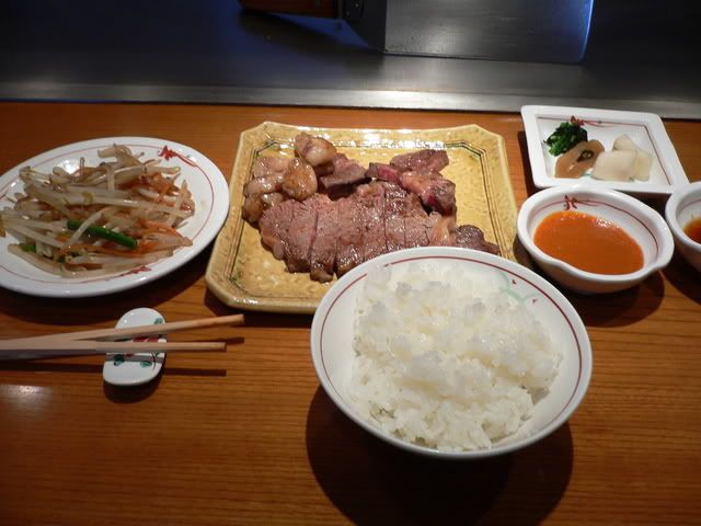 Today I had mixed seafood and australian beef. Comes with choice of 2 appertisers, rice, miso, dessert(apricot icecream and jelly, tofu?) and tea/cofee. Came up to JPY6,000 (including a coke).