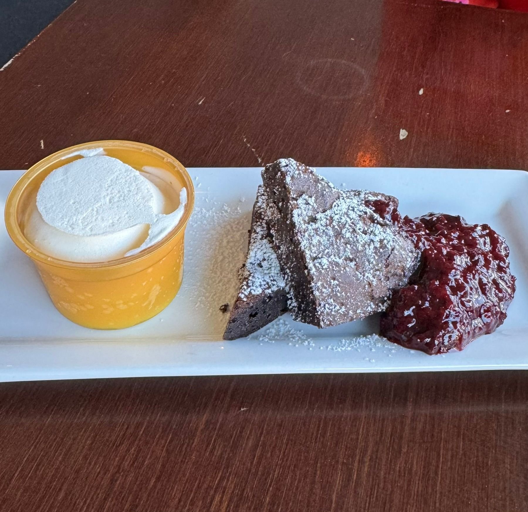 Our delicious dessert - brownie with berry compote and vanilla ice cream