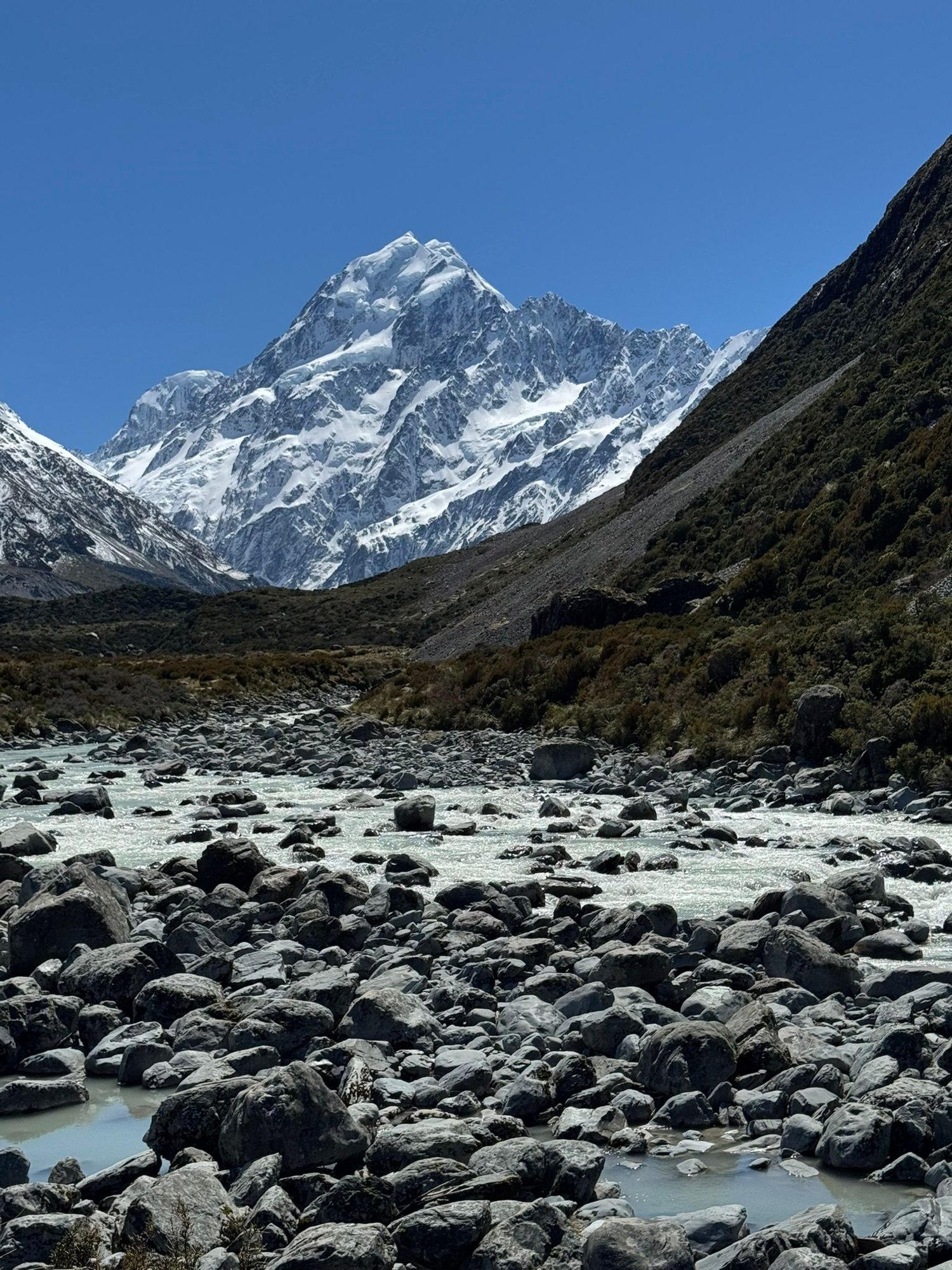 The Hooker River with Aoraki/Mt. Cook in the background.