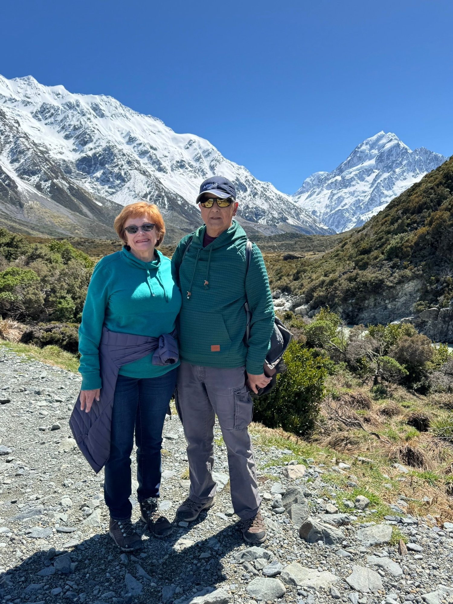 This is probably the most magnificent and stunning hike we have ever done. We were surrounded by snow-capped mountains, dramatic and rugged scenery, and for part of the way, the track follows the Hooker River. And, of course, there are many views of Aoraki/Mt. Cook, New Zealand’s tallest mountain. The track ends at Hooker Lake, a glacial lake with a few icebergs in it. At the lake there is a large picnic table and enough boulders to sit on. We brought snacks and bottled water. Many people brought sandwiches, etc. for their lunch. We spent about 45 minutes here.