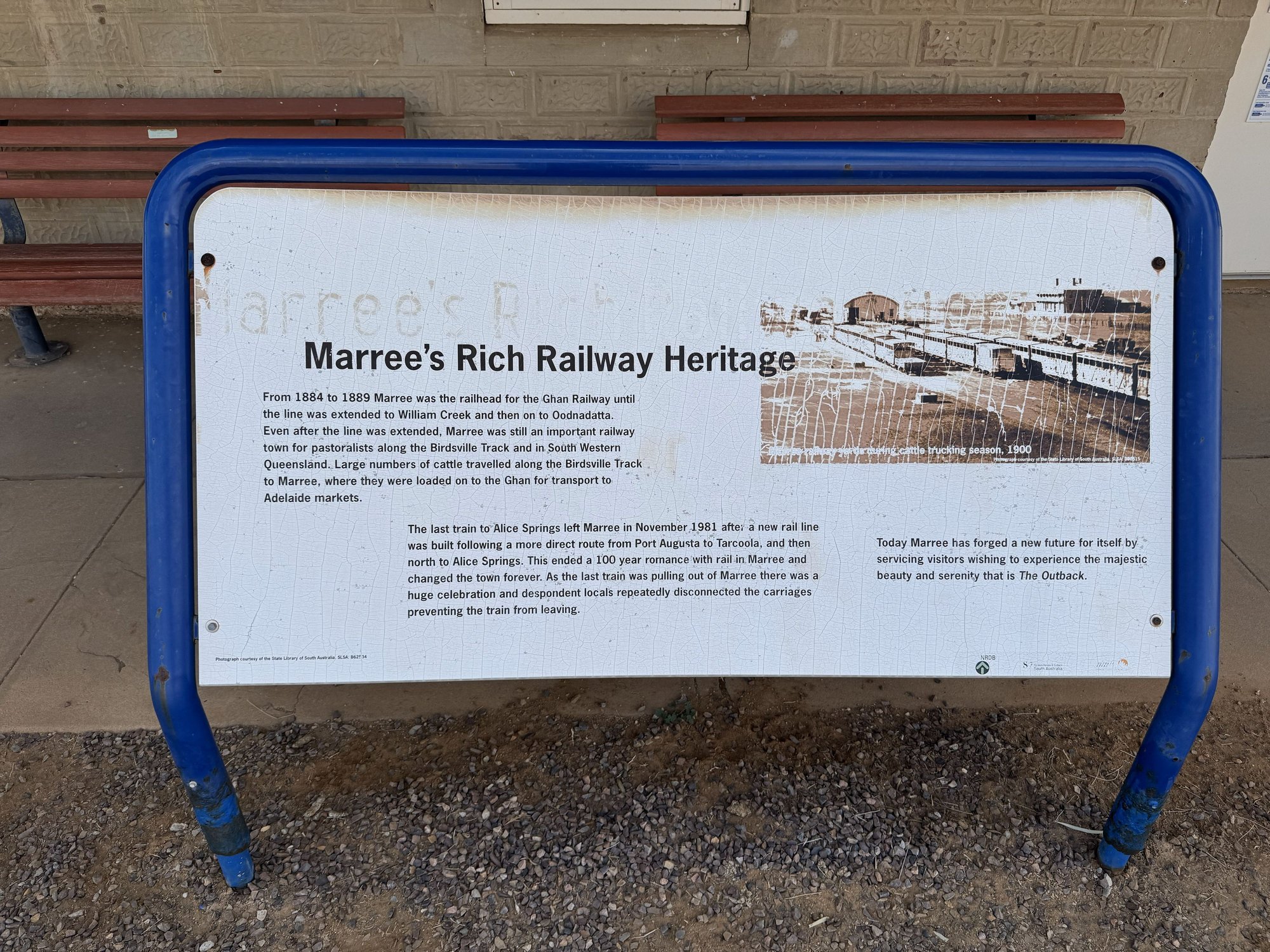 From our hotel we walked across town (maybe 300 meters) to the Marree Outback Roadhouse and Oasis Cafe that reportedly served excellent homemade meat pies and other food. On the way we took in some of Marrees history the old railway siding and a rusting narrow-gauge locomotive that once plied the Ghan Railway before it was rerouted further west and converted to standard gauge. Several panels described Marrees pastoral history and its role as a railhead for shipping cattle southward to Port Augusta, animals that had been driven all the way from Queensland and the Northern Territory down the Birdsville Track. A mechanical-looking sculpture of a camel paid tribute to the role the animals played in exploring interior Australia and the men (Afghans and others from the Middle East) who drove them. (With the advent of modern transport, camels were released into the wild where they thrived and are now considered feral pests that compete with stock and wildlife for food. I was really surprised we did not see any on our travels.)