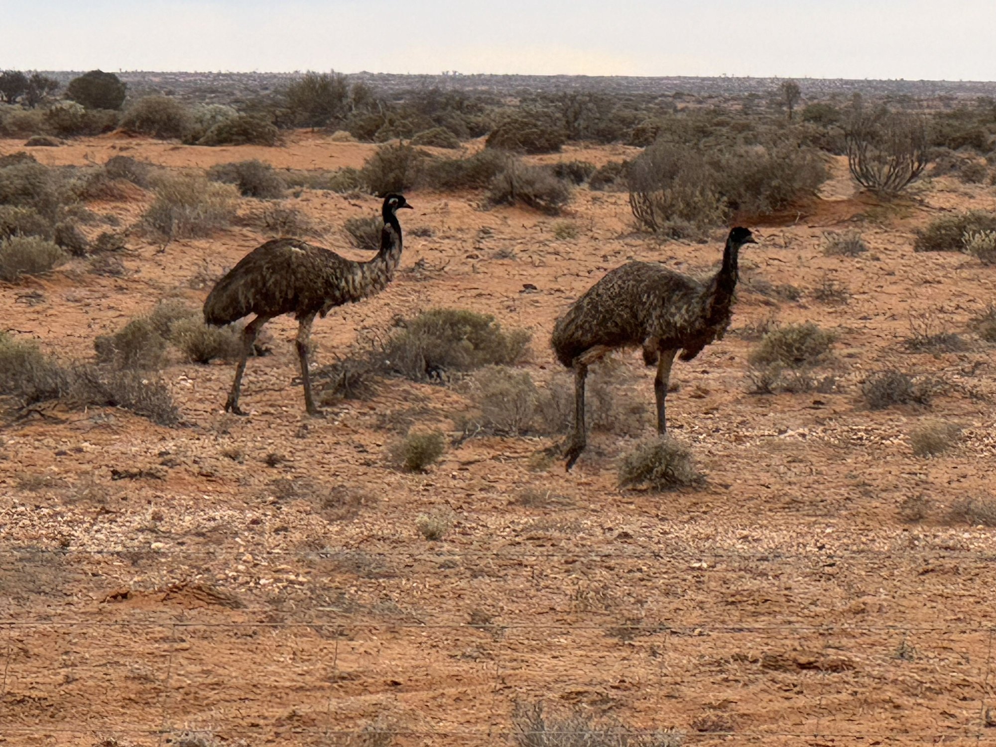 Tuesday July 15, 2025: Up to this morning, we had awoken during each of the last couple of weeks to a brilliant blue sky. But this day started out as it ended - dull and grey with occasional light rain. Marree is not only the terminus for the unsealed Oodnadatta and Birdsville Tracks but was also (for us) the beginning of the paved Outback Hwy, which we took, heading south towards Adelaide. Not far out of Marree we started seeing more wildlife about, particularly emus and the odd roo.
