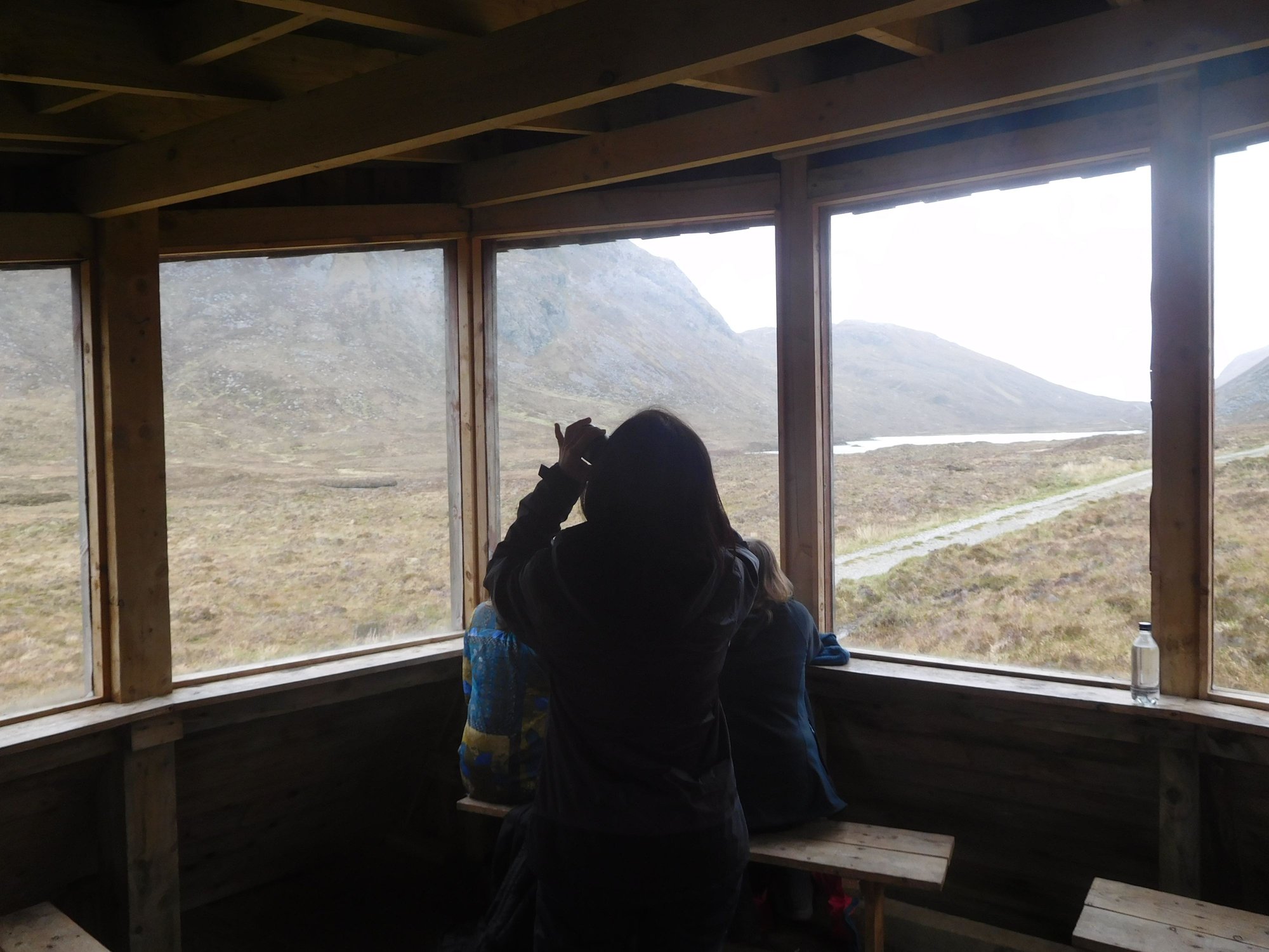 It’s a 2km walk from the car park through an absolutely beautiful glen to the hide. A group of two serious birdwatchers were already there, and we were happy to follow their lead. We found a pair of binoculars there for use by visitors and began looking. Over the course of about 75 minutes, we spotted three eagles - it’s a majestic sight watching them circling the skies in search for food.