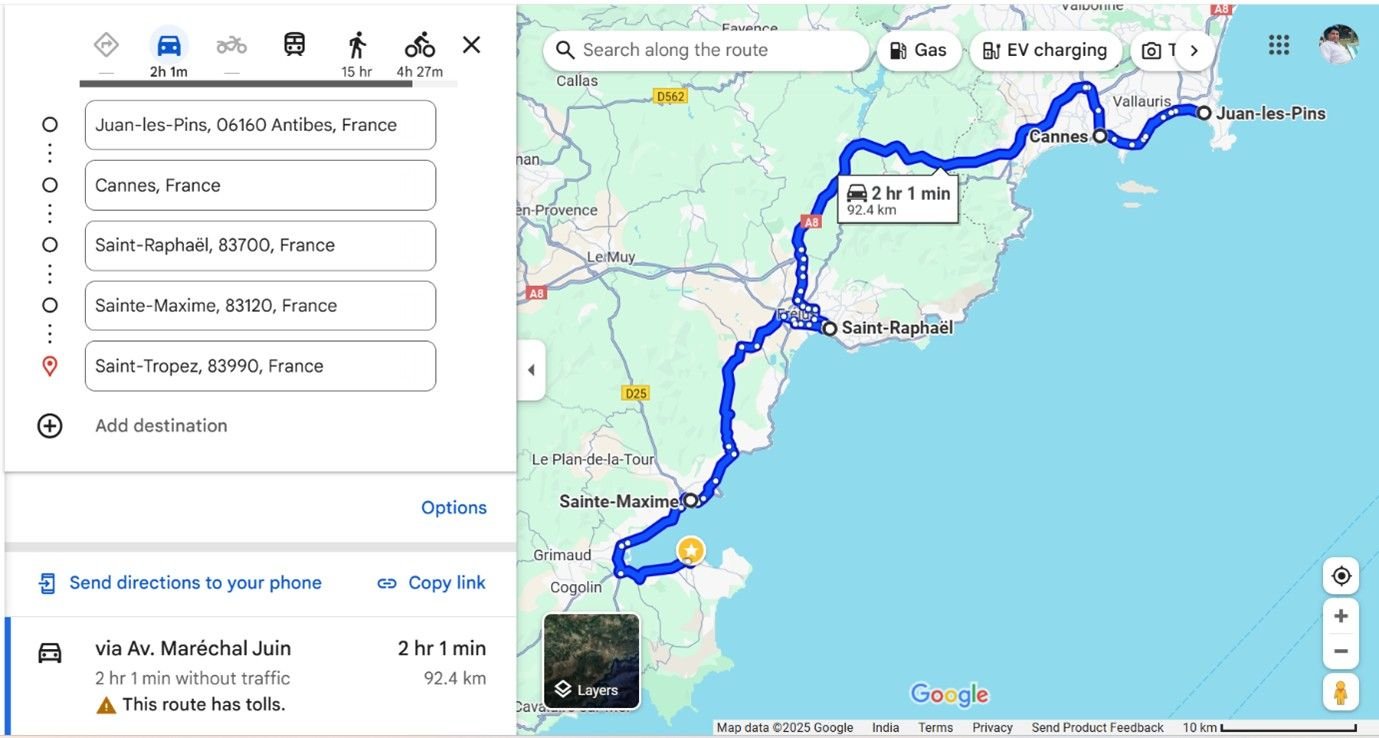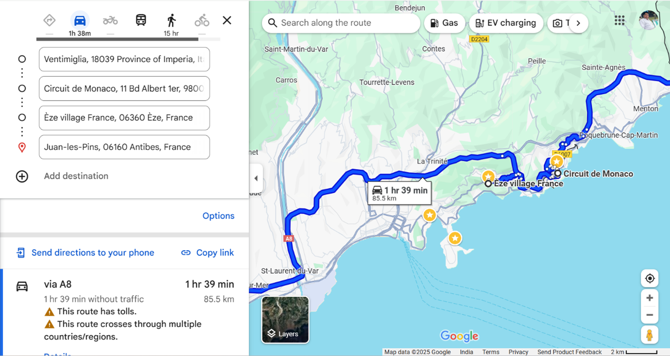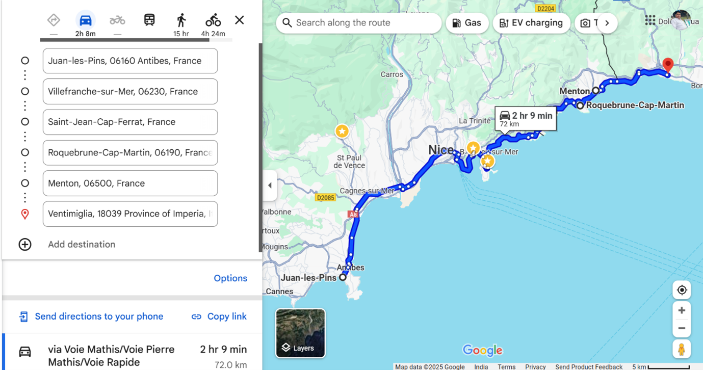 We had planned a little relaxed day after a long drive on the previous day. Also, knowing the fact that we were at the same place for 5 nights and relatively relaxed itinerary with fewer places to see, and rest of my DW’s family joining us to celebrate her nephew’s 6th birthday made us feel like a homecoming and a break from our long holiday.We got up at 7 am. Had Upma (a precooked dehydrated snack) and coffee and left at 8.40 am. Packed some food for the drive. Our farthest destination today was Menton, the western most town on the French Riviera, via Nice. We planned to stop at the places on our way back. We filled petrol after Nice.