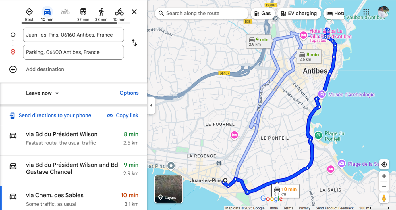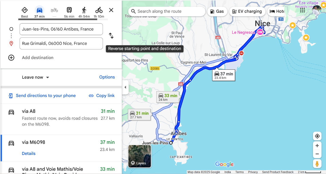 We took both the cars and drove to Nice. It took us 1 hour from Juan les Pins to reach 27km through traffic.