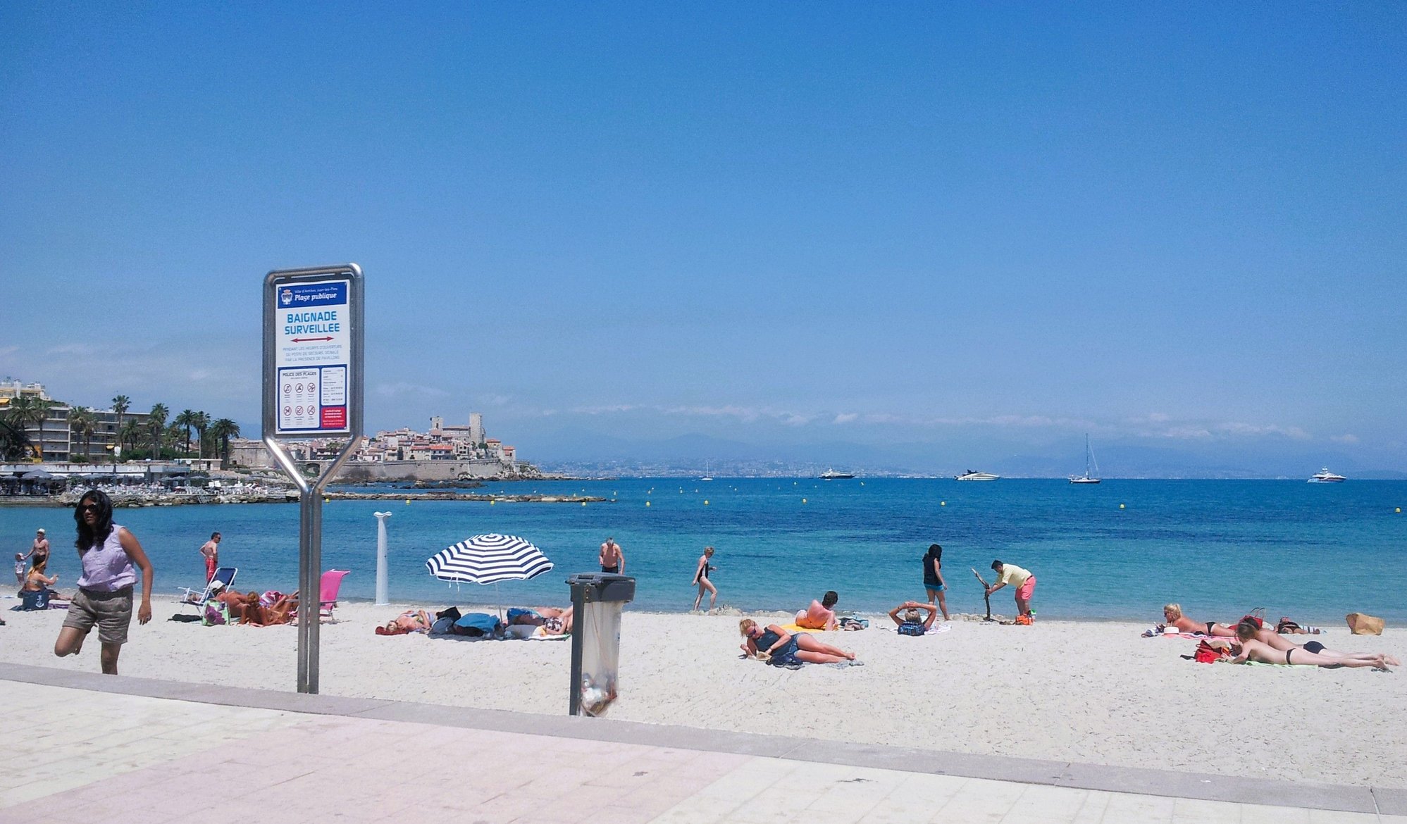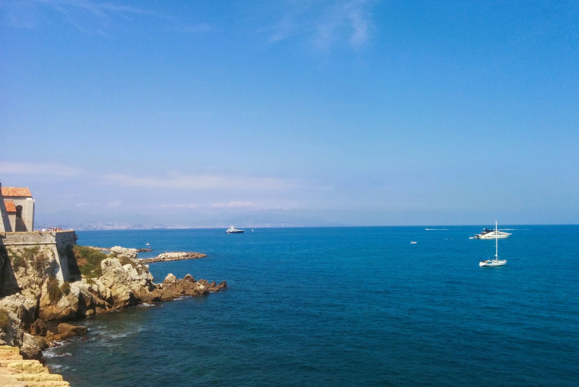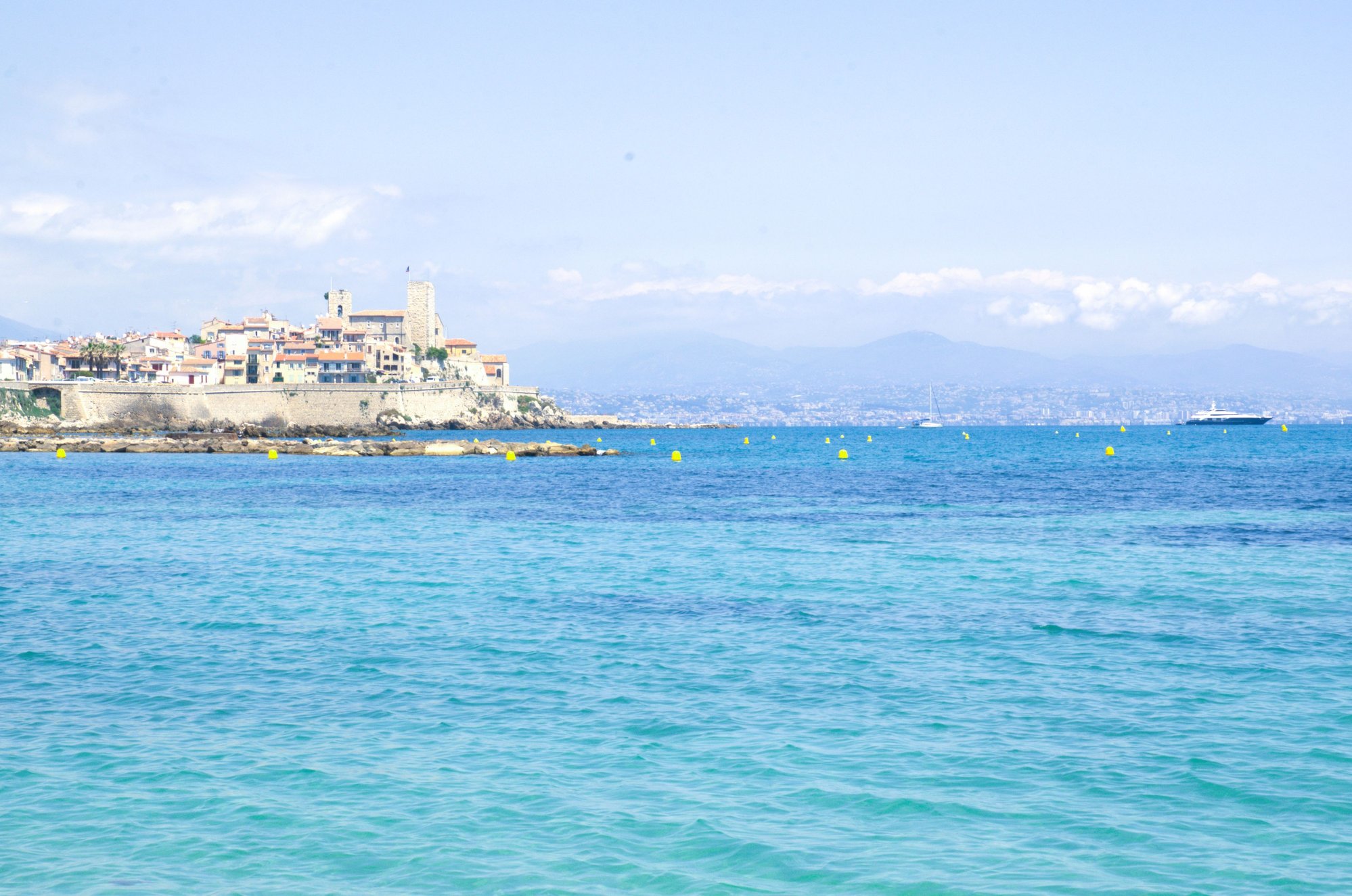 Crystal clear water here. Azure blue sea with Luxury yachts sailing in it. We could view picturesque Antibes old town from here.