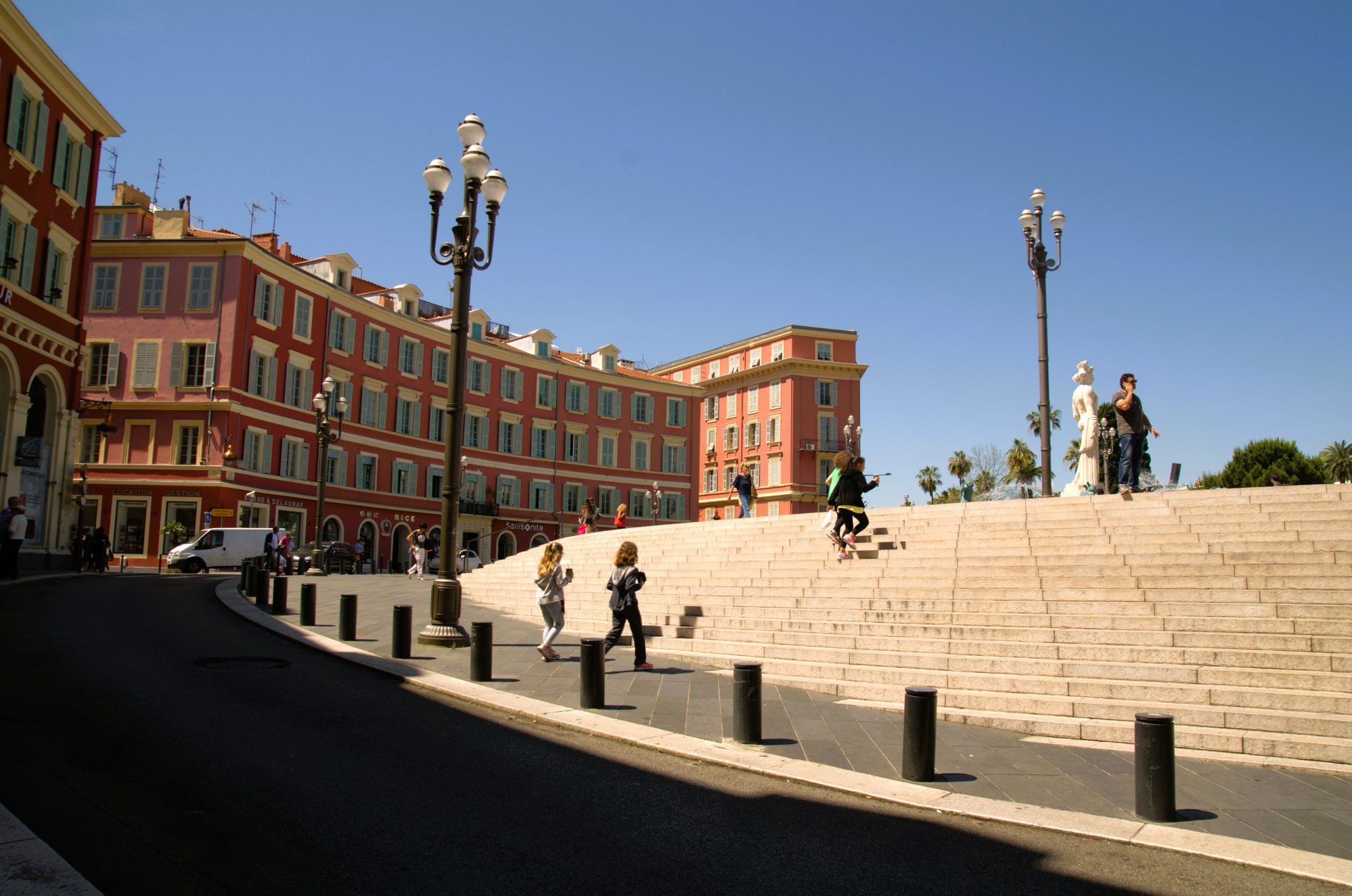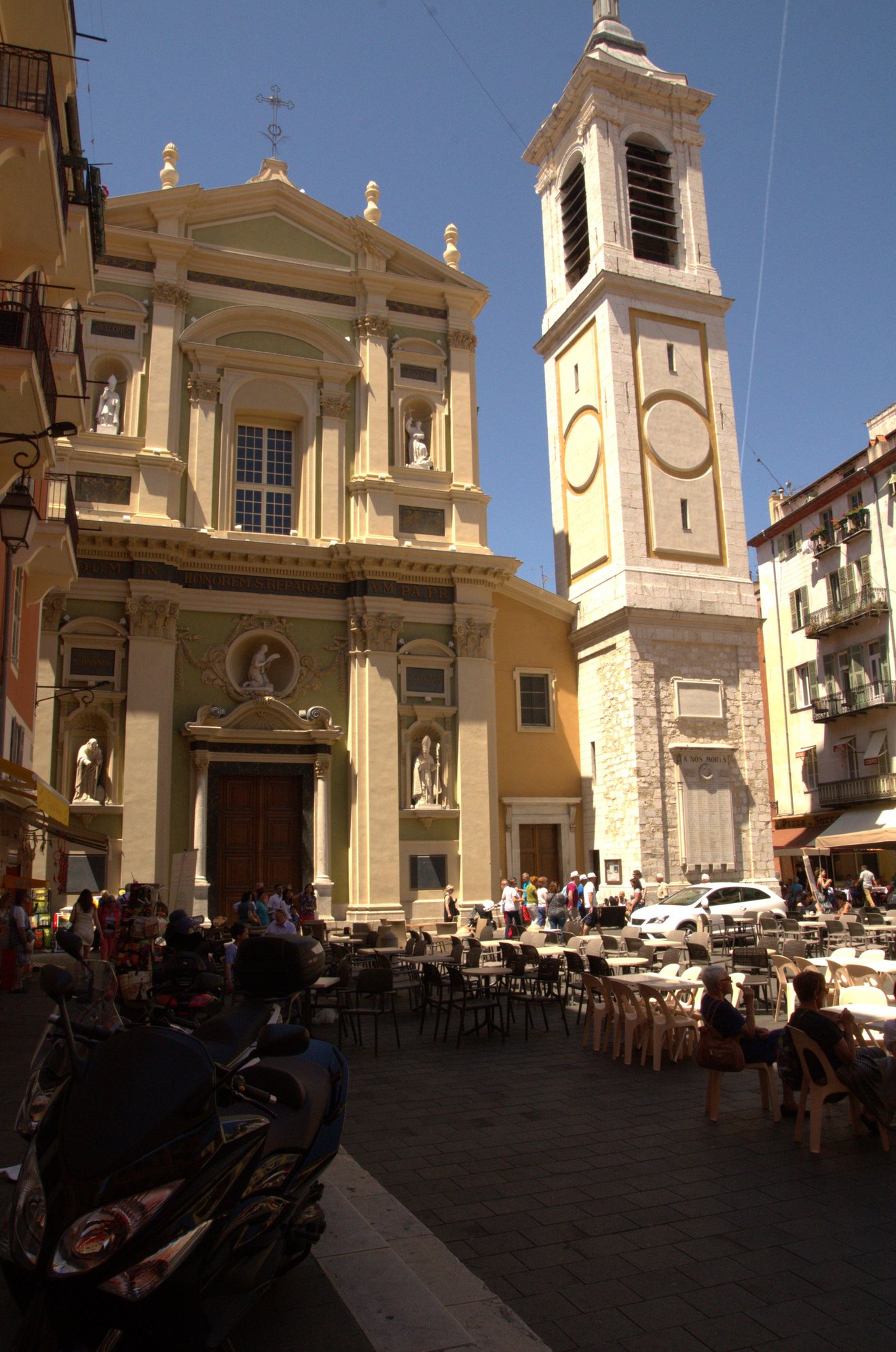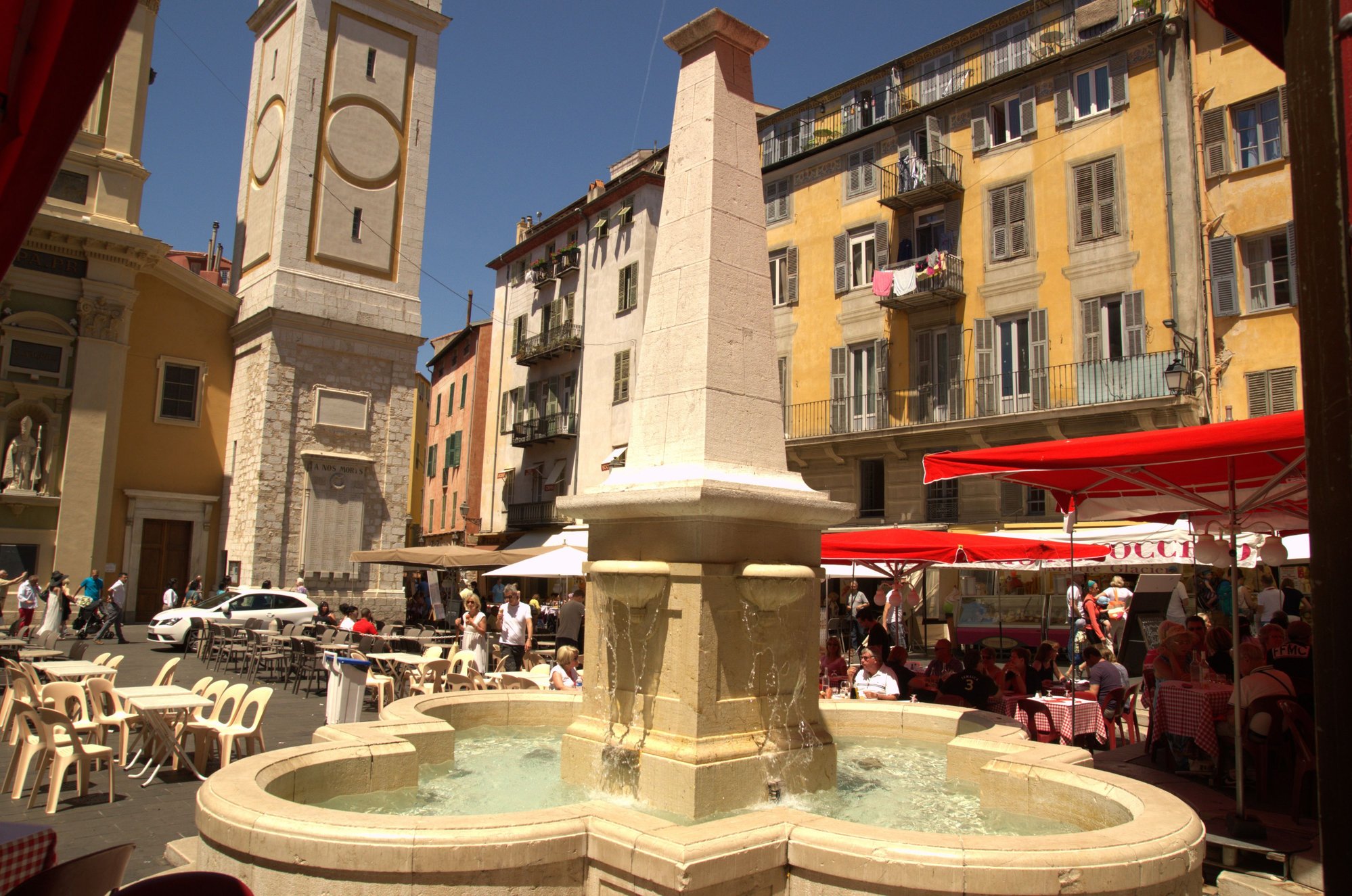 It has the Baroque Cathédrale Sainte-Réparate on its western side with a lively fountain with an obelisk in the centre