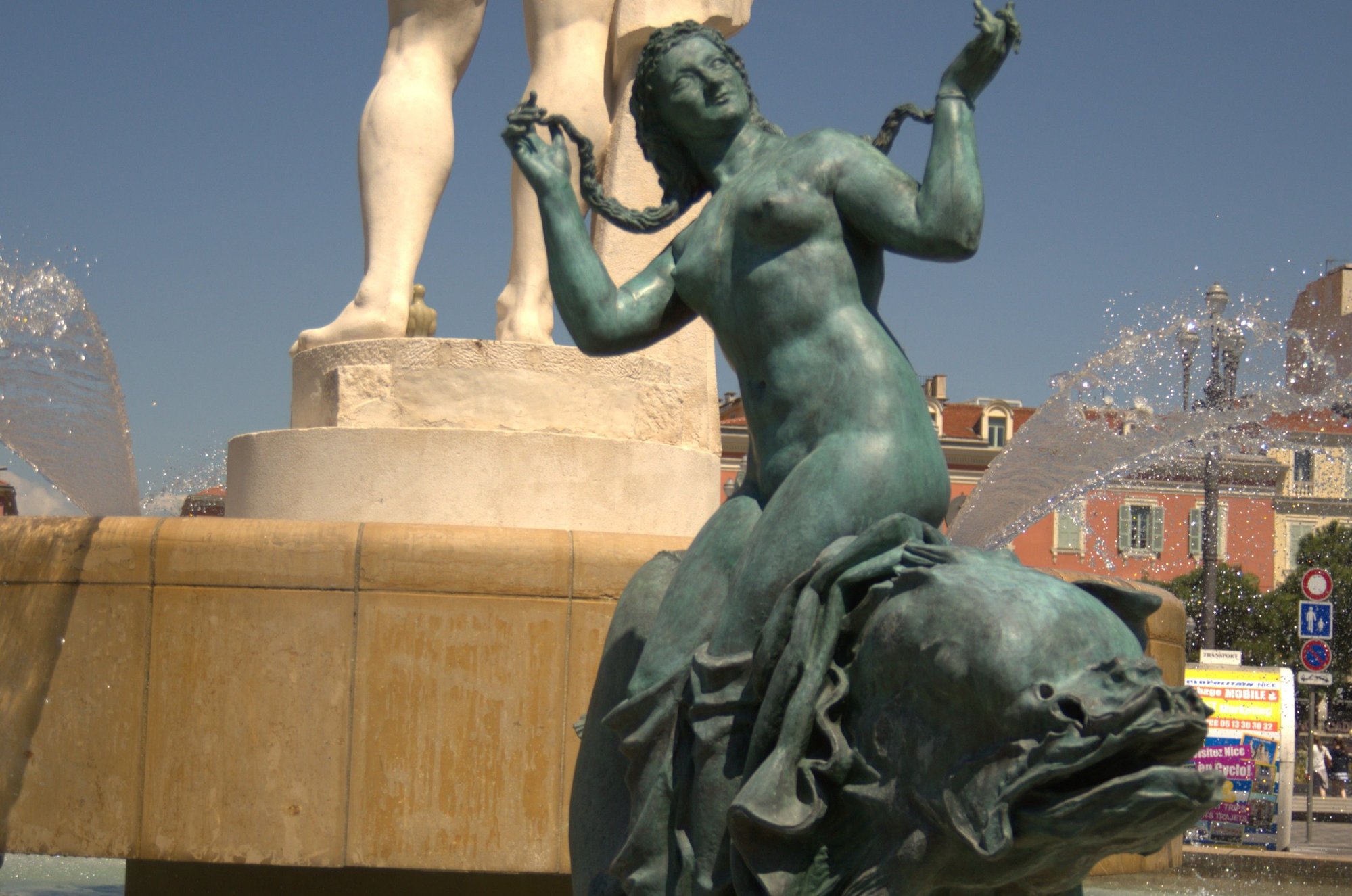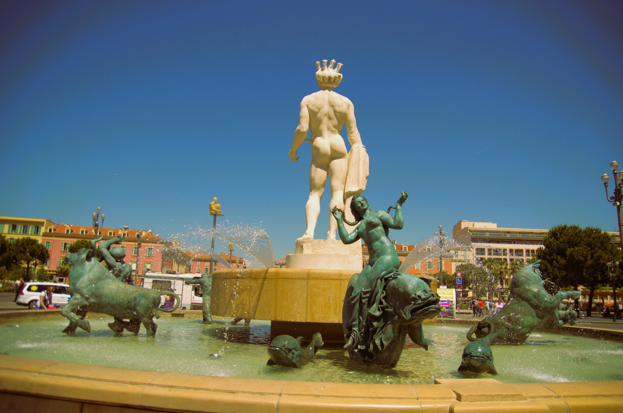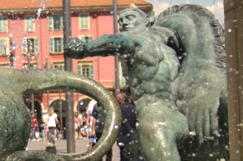 At Place Massena, there is a large fountain called the “Fontaine du Soleil”, the Apollo or Sun Fountain. There are 5 bronze sculptures in the basin and in the centre stands an impressive marble Apollo. He is 7 meters tall and weighs in at 7 tons. He is definitely the king of the square and you would think this giant would be admired and respected… but not by the Niçois.