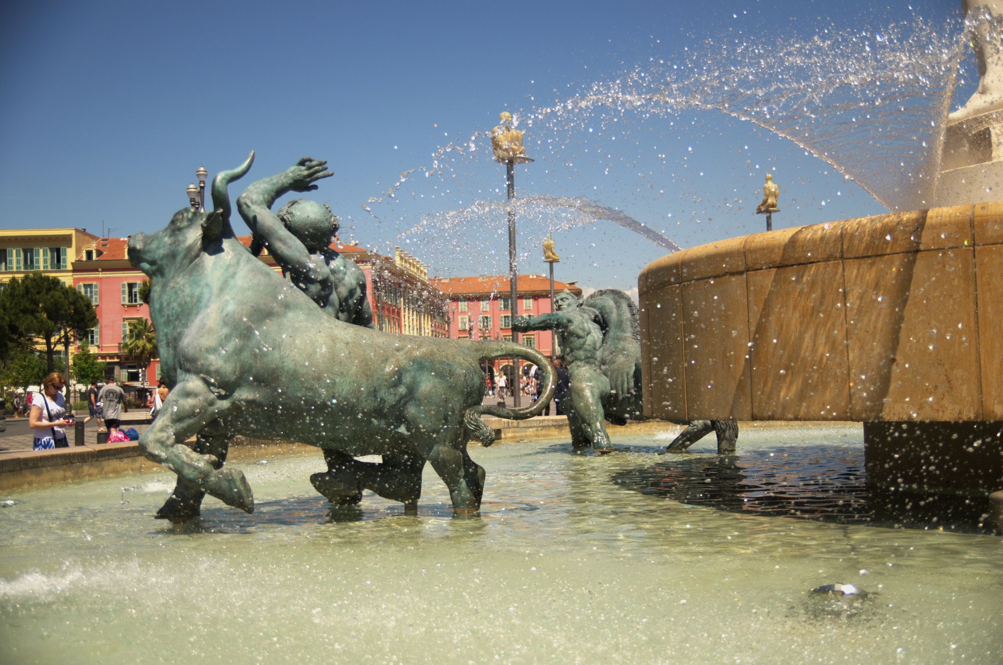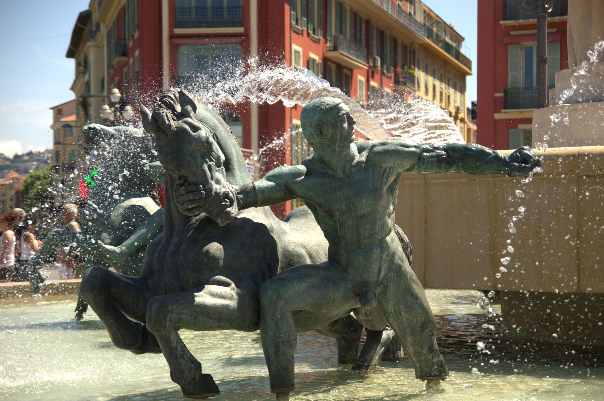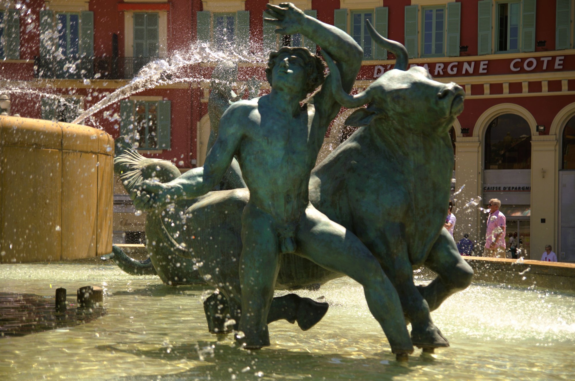 At Place Massena, there is a large fountain called the “Fontaine du Soleil”, the Apollo or Sun Fountain. There are 5 bronze sculptures in the basin and in the centre stands an impressive marble Apollo. He is 7 meters tall and weighs in at 7 tons. He is definitely the king of the square and you would think this giant would be admired and respected… but not by the Niçois.