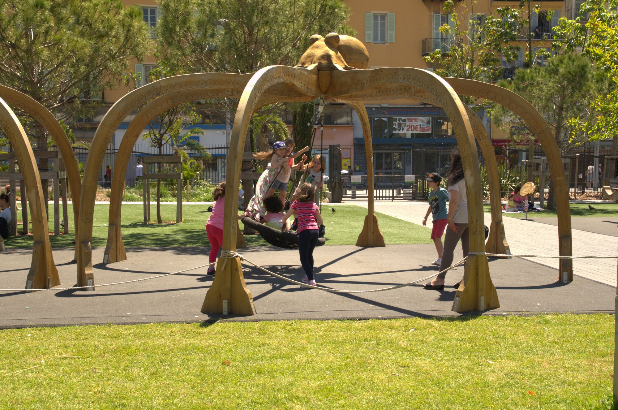 Everything in the park is designed to remind us of the river. The walkways are covered in aquatic coloured stone and there is a “plateau of mist” made by air pumps that blow tiny drops of water into the air. In the section for children, there are sea animals carved of wood for climbing, swinging, bouncing, etc. The whale, octopus, sting ray and turtle are all following the river toward the sea