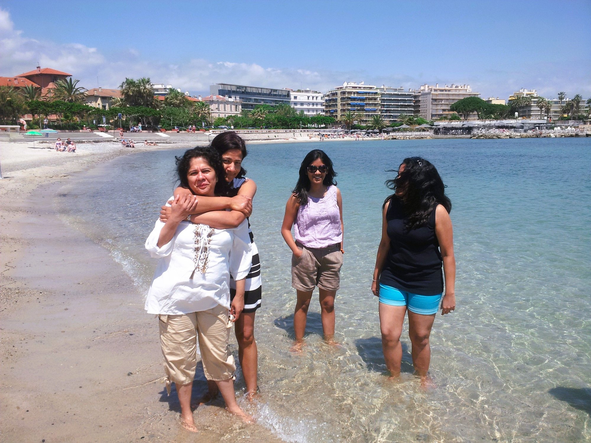 We walked down the winding paths to an open-air café “Pinocchio” Had Pizza, beer and potato chips. Nice ambience and good for people watching. We left at 3 pm. Poonam drove all the way back, as I had consumed beer. We reached in 1.30 hours via Nice. Shopped grocery in the nearby Intermarche store. Reached our apartment at Juan le Pins by 5 pm. We had coffee and relaxed a bit. We walked 5 minutes to my BIL’s rented apartment. Had a nice chat with the family. We were meeting after 2 years.