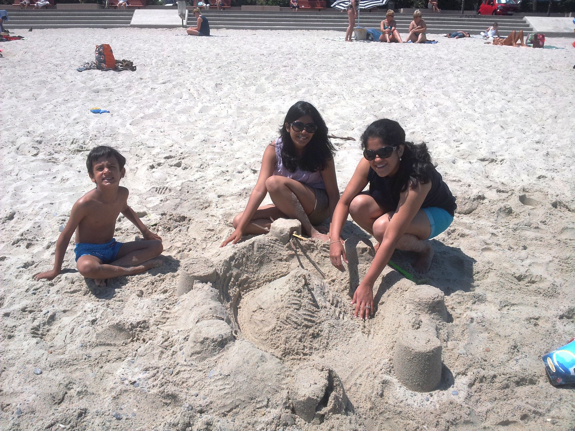 Parking meter was faulty and did not work. We walked on the beach and in the water. BiL, Priyanka and Hrithik made a sand castle with a moat around with great efforts so that waves could fill the moat with sea water. Rest of us relaxed on the beach. I did some long walk along the water. It was sunny with cool breeze. There were only a few families sunbathing on the clean and least crowded long beach.