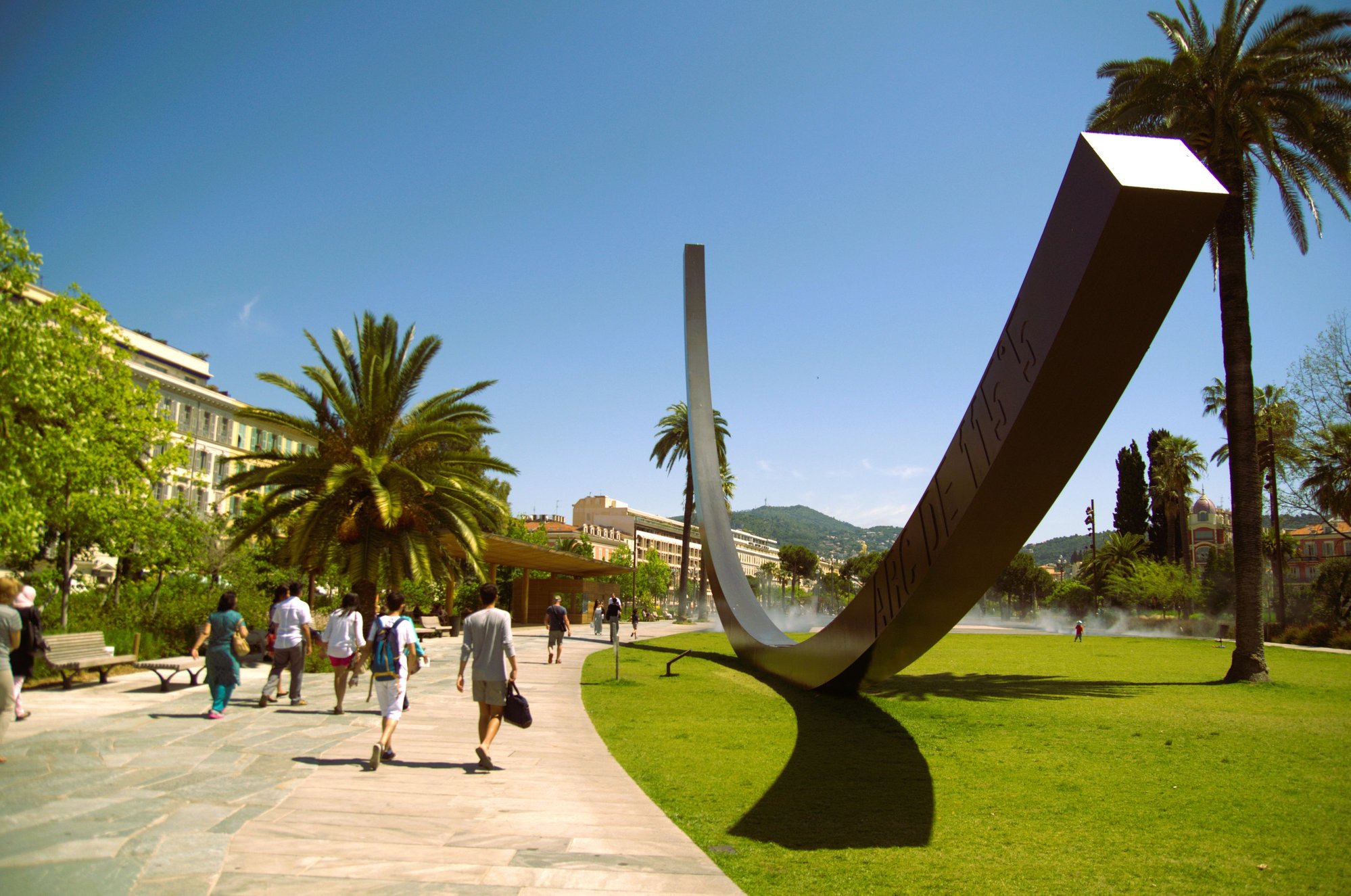 The "arc" in Promenade du Paillon refers to the sculpture "Arc de 115,5°" by Bernar Venet, located in the Jardin Albert 1er, which is part of the Promenade du Paillon. This sculpture, a large steel arc, is representative of the Nice coastline along the Promenade des Anglais