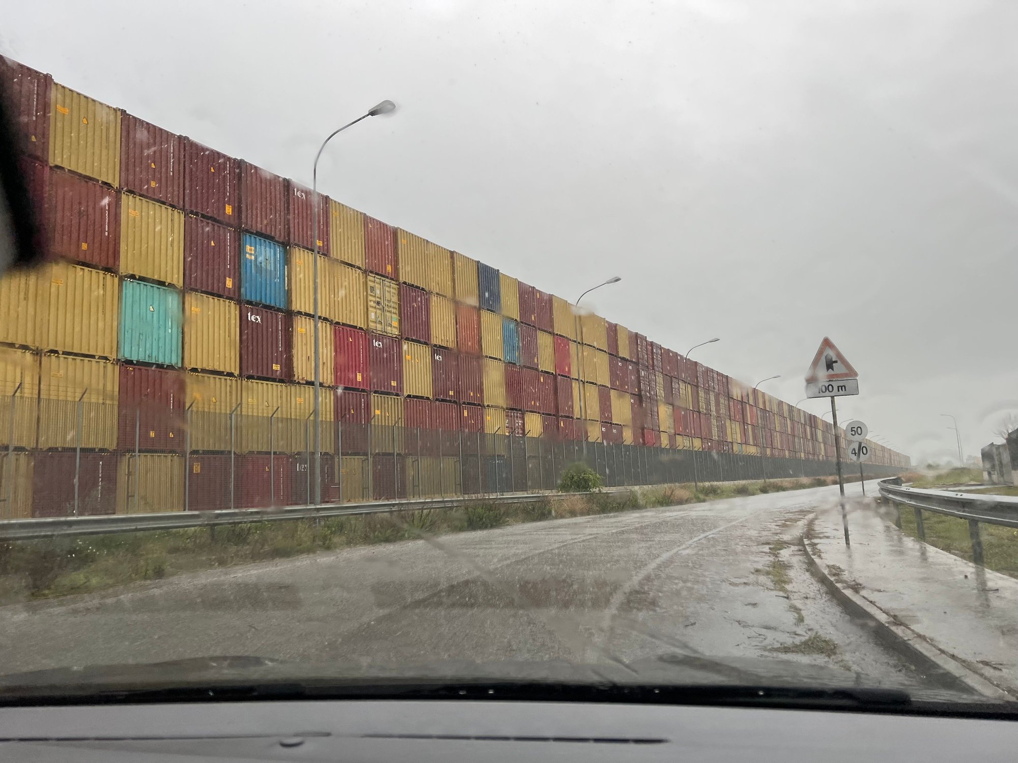 We left Tropea on Sunday in heavy rain and thick fog. We eventually regretted taking the pot-hole filled slow coastal road, because the low clouds and fog left nothing to see. We did pass a massive port seemingly out in nowhere. There were so many containers, we thought we were in New Jersey. We checked, and the Gioia Tauro harbor is the largest port in Italy in terms of container shipments and one of the biggest in all of Europe.