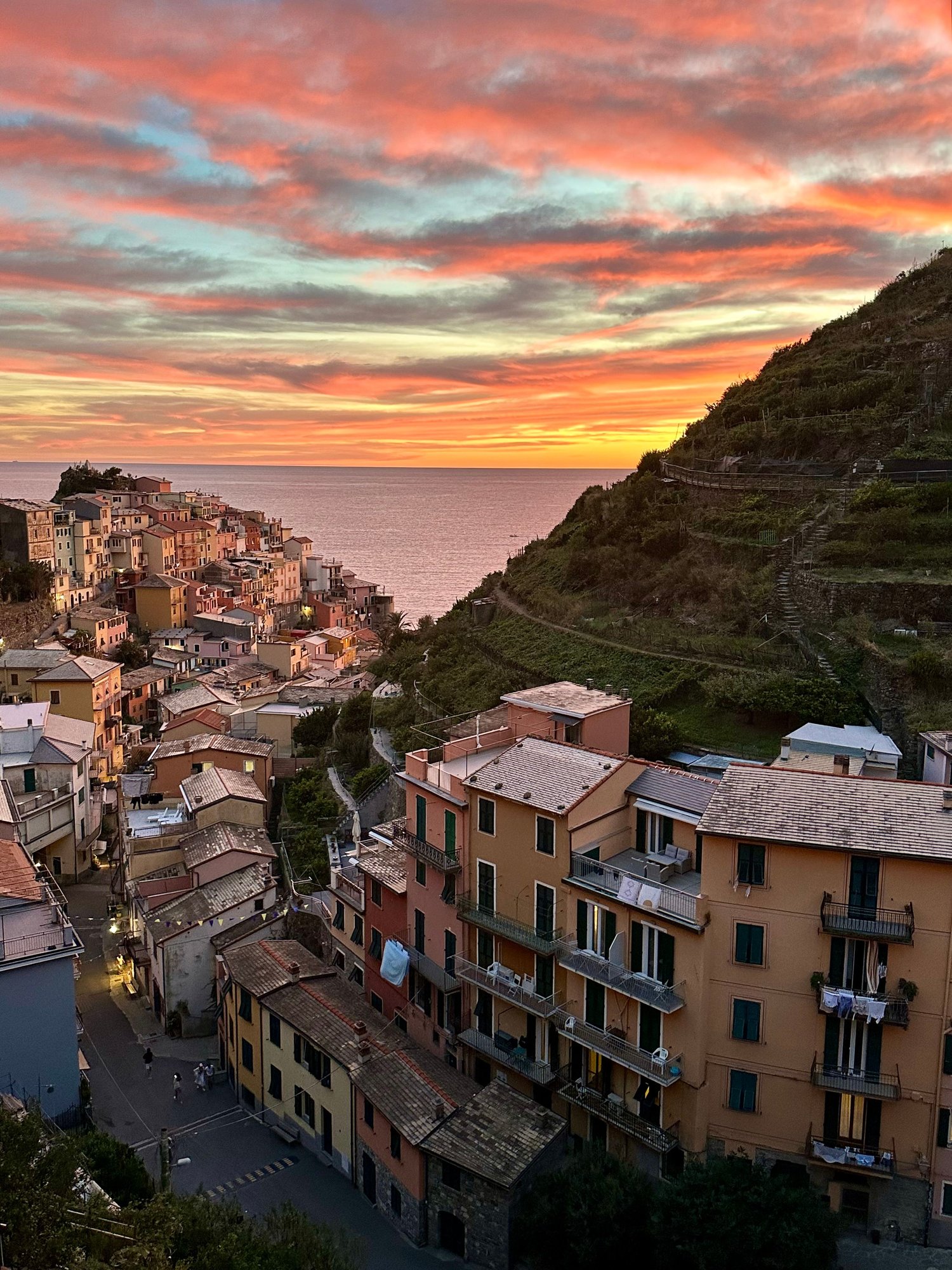 We stayed in the top floor apartment at Casa Capellini in Manarola. It's a hike uphill from the train and a narrow stairway inside up to the apartment but you are up and away from the madness below. Living area and kitchen, and the balcony included a clothesline to take advantage of the quick-drying breeze off of the sea. Owner was incredibly helpful well prior to our trip with hiking trail guidance and restaurant suggestions and reservations. Oh, and did I mention the to-die-for balcony view at sunset?