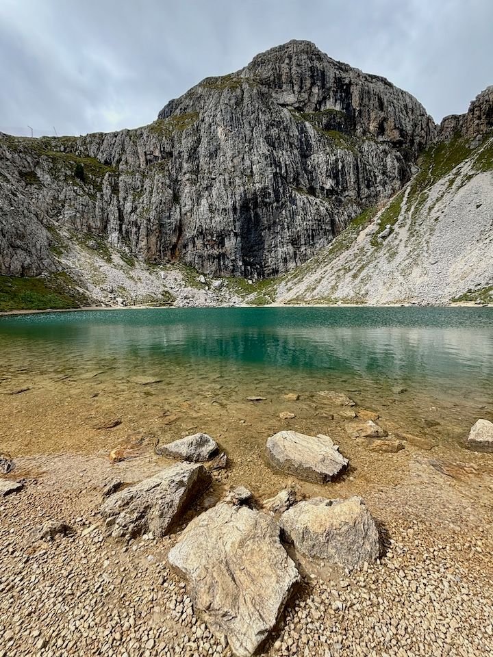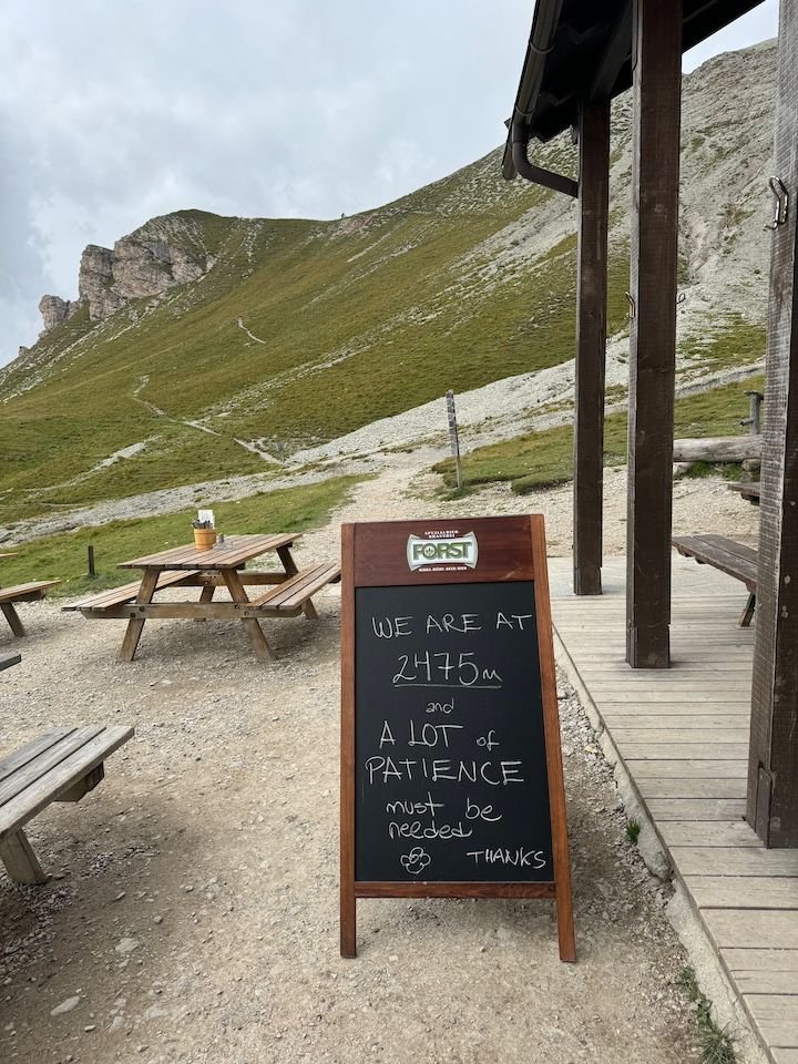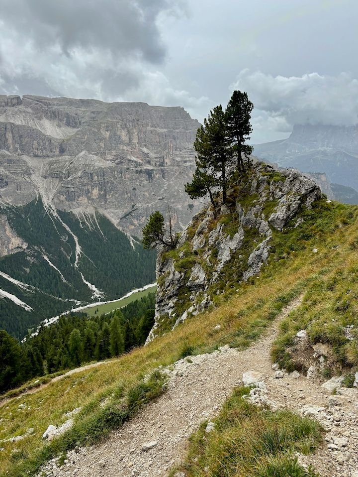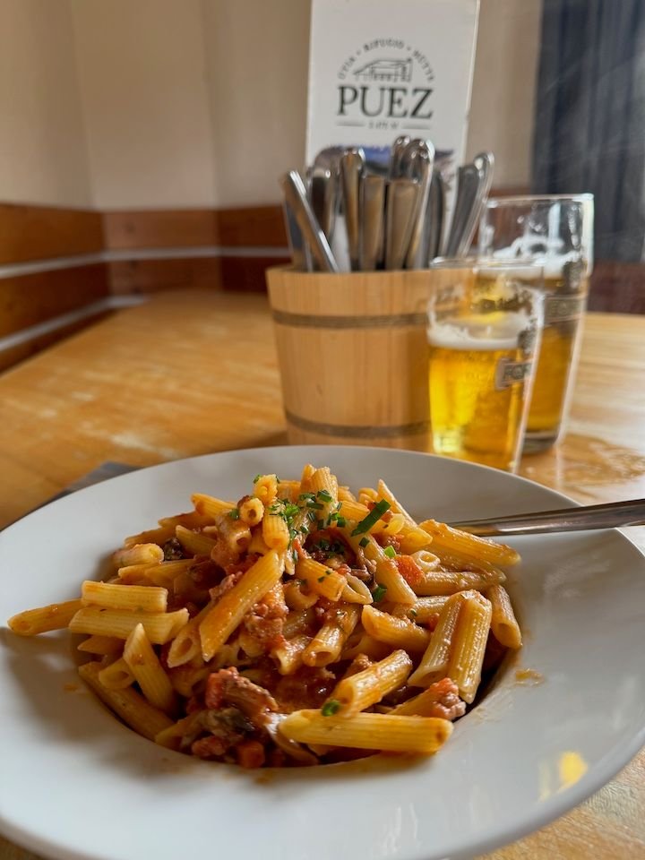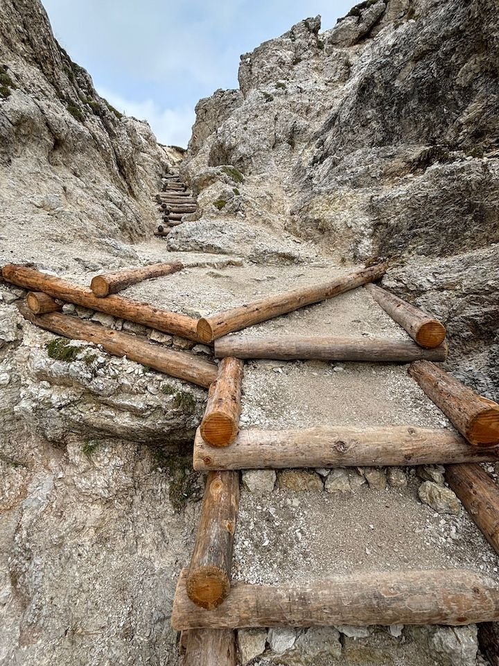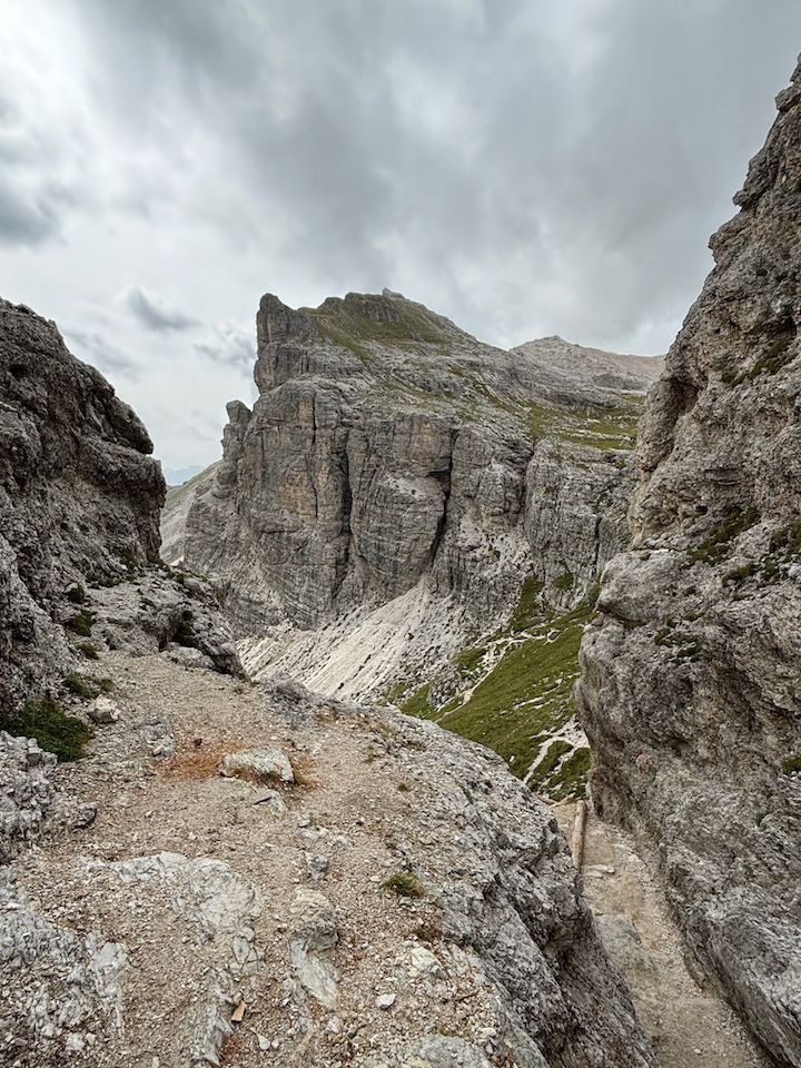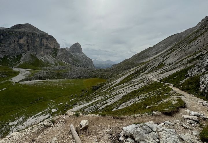 Ultimately, this became a 7-hour hike, 30,000+ steps, 1,000-foot elevation gain and 2,000+ descent—our most intensive hiking day of the trip. We did end up soaked, but fortunately not until we were down in a flat valley. That walk down from Rifugio Puez would have been significantly more challenging in the rain.