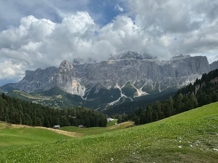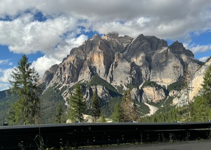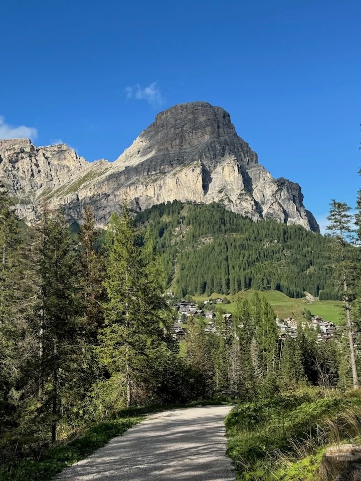 Asolo to Colfosco is about 2.5 hours. Because the forecast for the week ahead was iffy, we hoped to arrive early enough to start hiking right away. Then we learned it was Sellaronda Bike Day. The roads ringing the Sella Group—which include the Campolongo, Gardena, Sella, and Pordoi passes—would be closed from 8:30 am to 4:30 pm so that cyclists could enjoy the roads without motor vehicles. Great idea, but it meant that the town of Colfosco and our accommodation would be inaccessible until late afternoon. We used our time to enjoy a bit more of the area around Asolo (see above) and then took a less direct route over the Falzarego pass, arriving in the adjacent town of Corvara right around the time the road reopened.