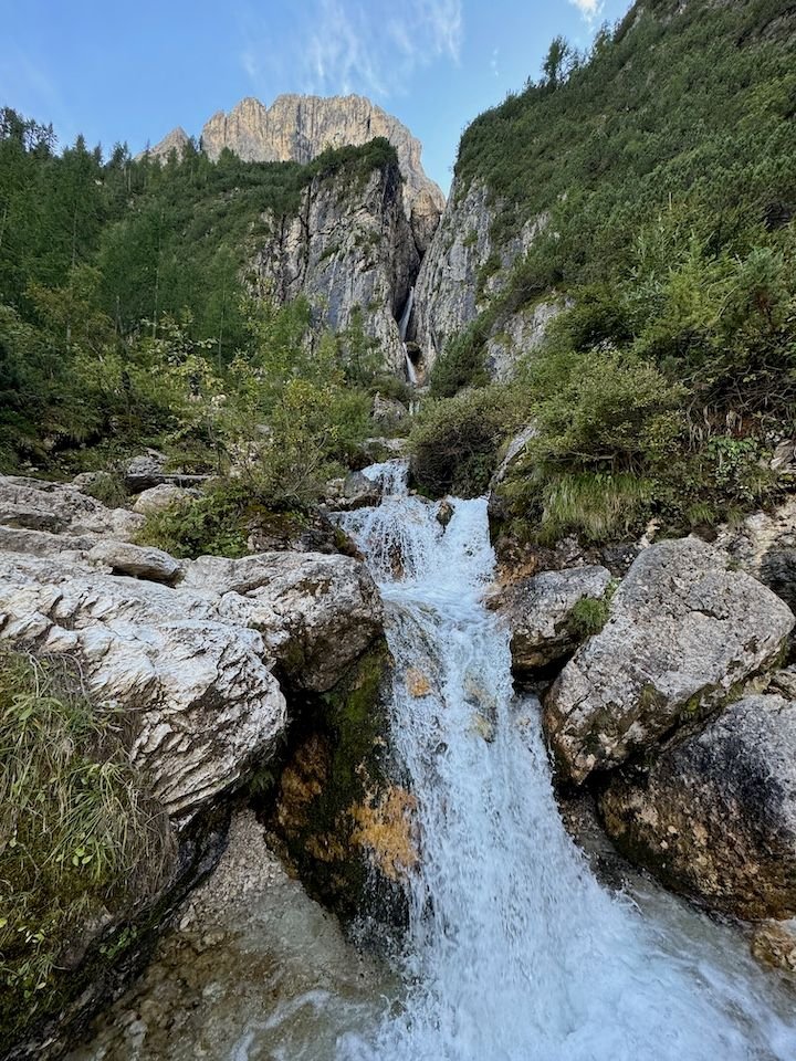 Once back in Colfosco, we ended the day with the approximately one-hour (each way) and relatively flat Borest trail to the Pisciadù falls on the north face of the Sella Massif. A beautiful walk, especially at golden hour.