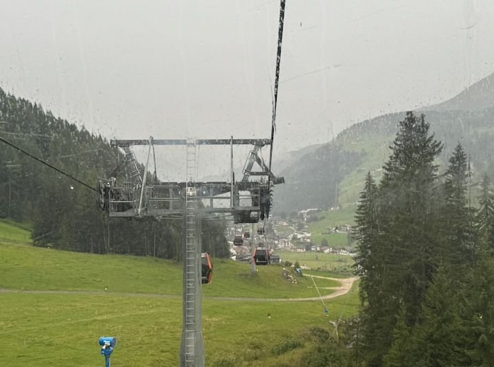 There’s a long, 4-kilometer gondola ride (12 minutes) to the top of the Kronplatz—elevation 2,275 meters (about 7,500 feet). The man selling tickets at the lower station casually said, “You know it’s snowing at the top of the mountain, right?” That became evident about halfway up.