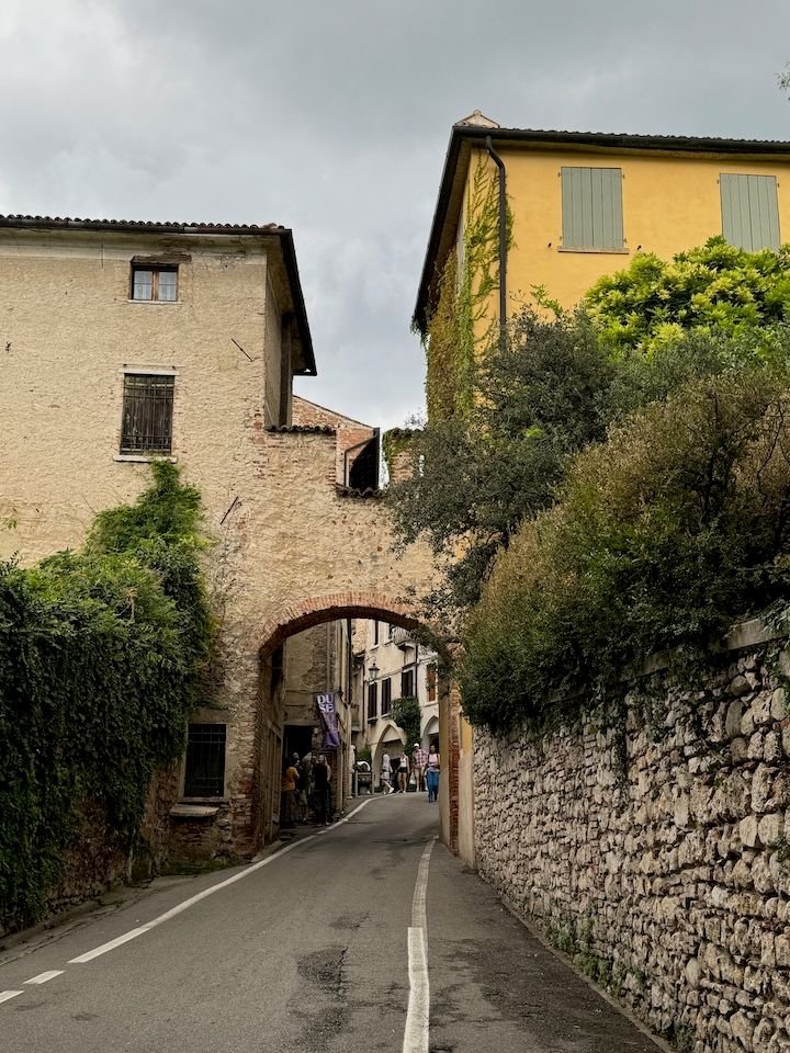 Our transition stop on the way north was the town of Asolo. We spent two nights in Asolo in 1991 as the last stop on our first European trip together. It was a different season (November). The skies were gloomy, not ideal for this town that sits at the intersection of the Veneto plain and the mountains and is known as the “city of one hundred horizons.” It has always been in the back of our minds as a place we’d like to revisit, if our itinerary presented the opportunity. We were pleased to find the center much as we remembered it from 33 years ago—albeit with sun and lovely views this time.