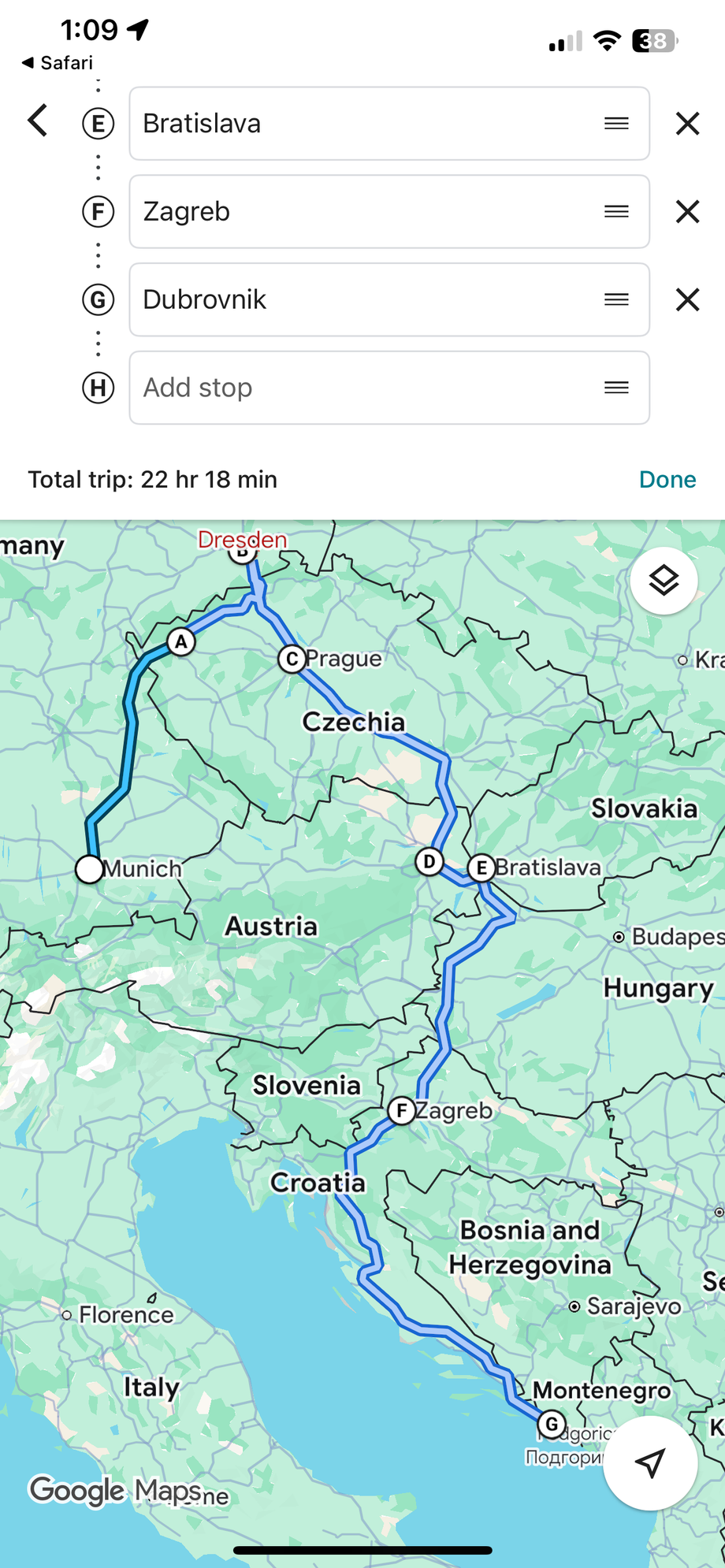 I’m planning a trip to Europe from November 1 to 22. I plan on taking a direct flight from Los Angeles to Munich. After a few days enjoying Munich, I plan on renting a car and road tripping across Europe, visiting Dresden, Karlovy Vary, Prague, Vienna, Bratislava, Zagreb, Split, and finally Dubrovnik.