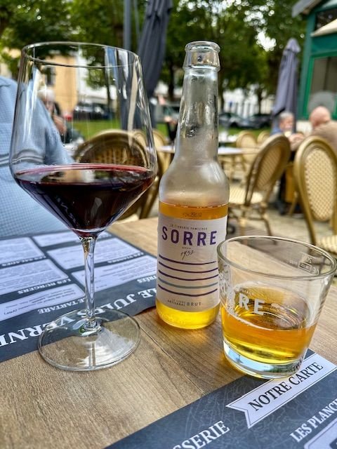 Arriving in town our map took us to the wrong house and the picture of the address on Google maps showed the house that we were at (which was wrong). We finally figured it out but couldn’t check in yet. We parked the car we walked into town and dined Al fresco at Le Jules Verne. Cold drinks and a nice lunch of steak, frites and salad.