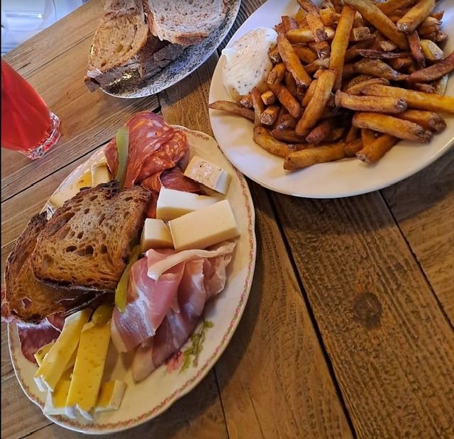 Dropping off our luggage we headed to find a cold drink and some food. We ended up at La Beret and sat outside with lots of locals. We had a nice conversation with two French men while we enjoyed our wine. We ended up enjoying a charcuterie board, Gougères and some fries. Our eyes were bigger than our stomachs. The atmosphere was lively and made for an enjoyable time.