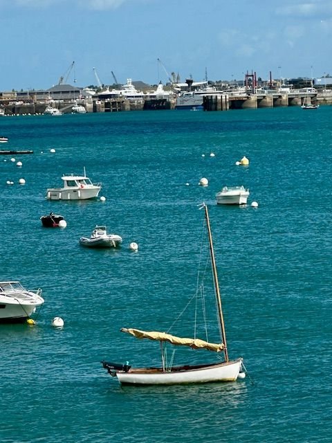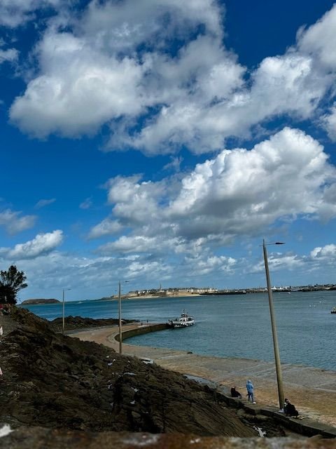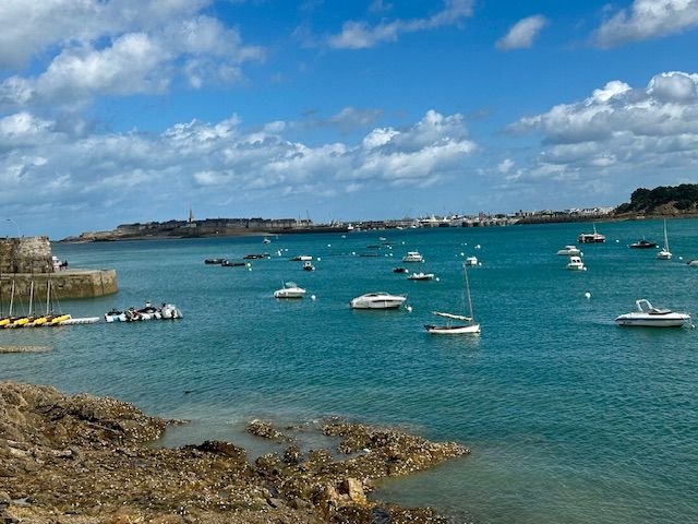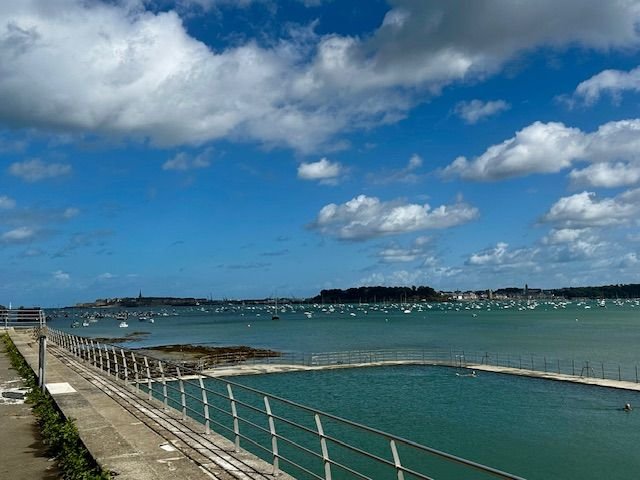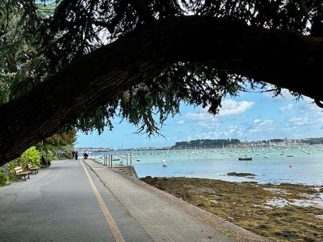 The drive from Pont Aven to Dinard was another winner. We wound up finding a parking spot right by the bay. Perfect for going for a walk to explore some stunning homes and being close to the water. The sun was out and the water was sparkling. There were a lot of children getting ready to go out for a sailing lesson. We walked along the walkway stopping to admire St. Malo across the bay and the beautiful plantings in gardens on our left. An older woman was hanging out her wash to dry on a balcony that overlooked the bay. What a view.