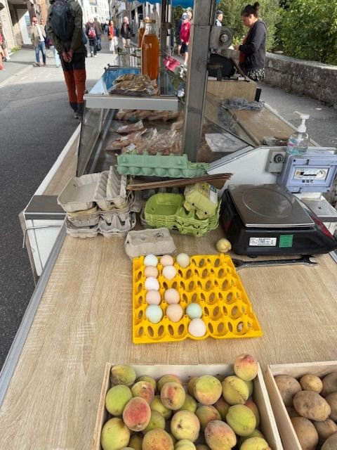 We knew the weather would be changing so we went for a long walk along the river and then back through the town. The farmers market was being set up and we found our way through that to a path that led behind the building. It was a promenade that was next to the river but behind buildings beautiful plantings and benches to enjoy along the way. Was interesting to see the walls behind the houses and how they had stairways leading to the river. We got to see some of the moulins and learned about the history of the town.