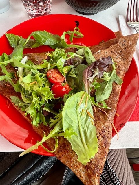 Dinner that night was a challenge also but we ended up having a galette with salad and split a galette sucre. It’s great how people can take dogs to restaurants. All the dogs we saw were so well behaved.