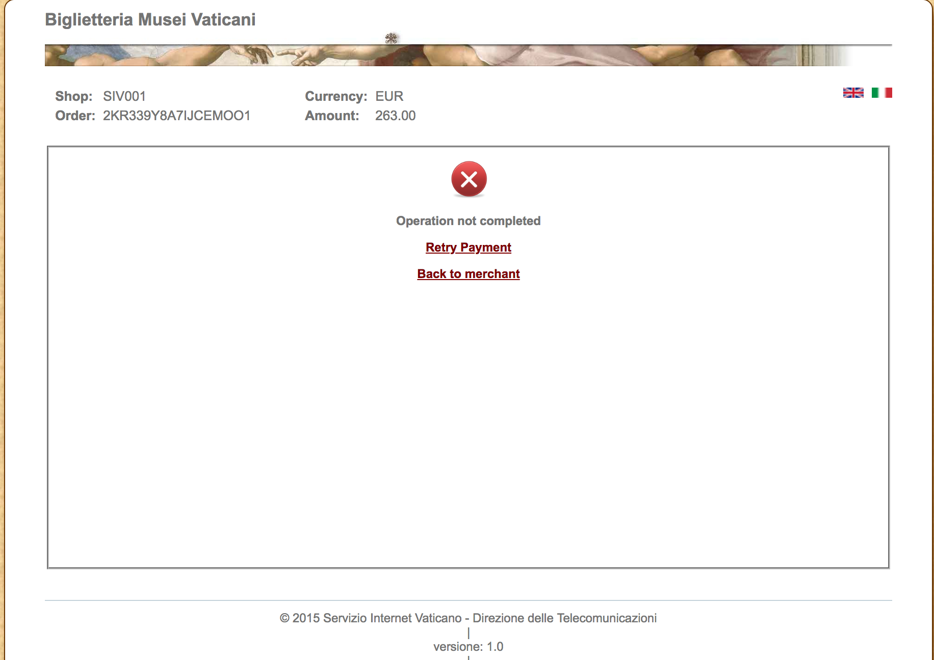 This is a long shot, but I'm wondering if anyone else is having trouble trying to book Vatican Museum tickets directly from their website? I keep getting the error shown below during the payment processing step.