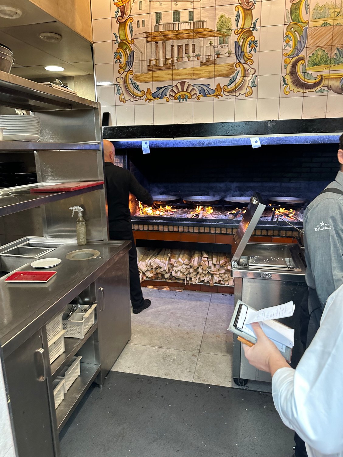 When we arrived, we were surprised by the scale of this place. There were local families, some tourists, and many others waiting within the entrance area to be seated. Everyone had a reservation. Despite the chaos and a couple or two who jumped the line, we were seated within a few minutes of checking in. This place is massive, but the operation is managed and conducted like a symphony. For example, inside the bathroom there’s a timetable with check marks showing that the bathrooms are cleaned every 10 minutes! Across the way, the kitchen has a long corridor of raging fires with 20-30 pans or more of paella fired up! After some