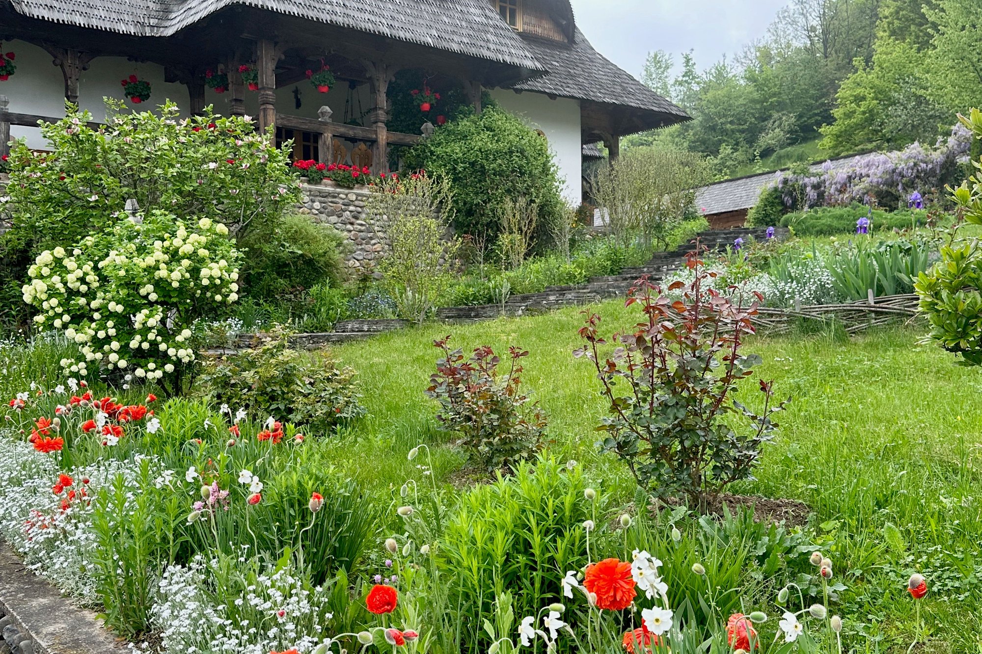 I was wowed by the scenery, from snowcapped mountains to gently rounded hills, lush farmland to forested hills, quiet rivers and rivers rushing with runoff… And May is a glorious time to visit Romania, perhaps especially in the north and in the mountains. There were blooming fruit trees interspersed among the deep, dark green of coniferous trees and the light, bright green of new deciduous leaves; and nesting storks on just about every pole. And flowers galore -- wonderfully colorful and aromatic flowers. It seemed that every house had a lilac or some iris (or both), and some of the walled churches and monasteries were powerfully redolent of lilac.