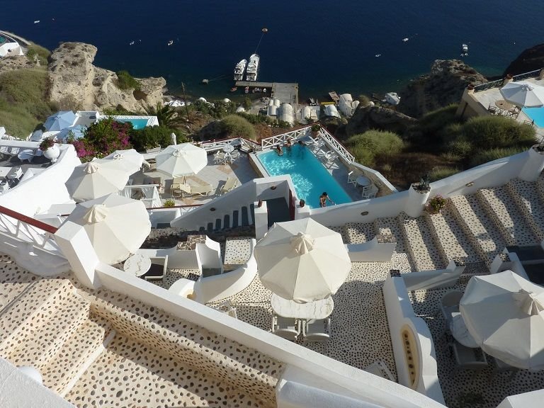 About the hotels with caldera views on Santorini - I think most will have steps, some many steps. The buildings are built down the side of the cliff. We stayed at one place in Oia where the front door to the hotel was street level but then the rooms all went down the cliff, one or two rooms per level and the pool was at the bottom, about six levels down. It was all open paths and steps with views from every room (and all gorgeous!). If you are concerned about stairs, check photos from the hotel website as well as traveller photos from review sites, that way you'll get a better picture of what you are booking. Happy to post a picture or two that gives you a better idea.