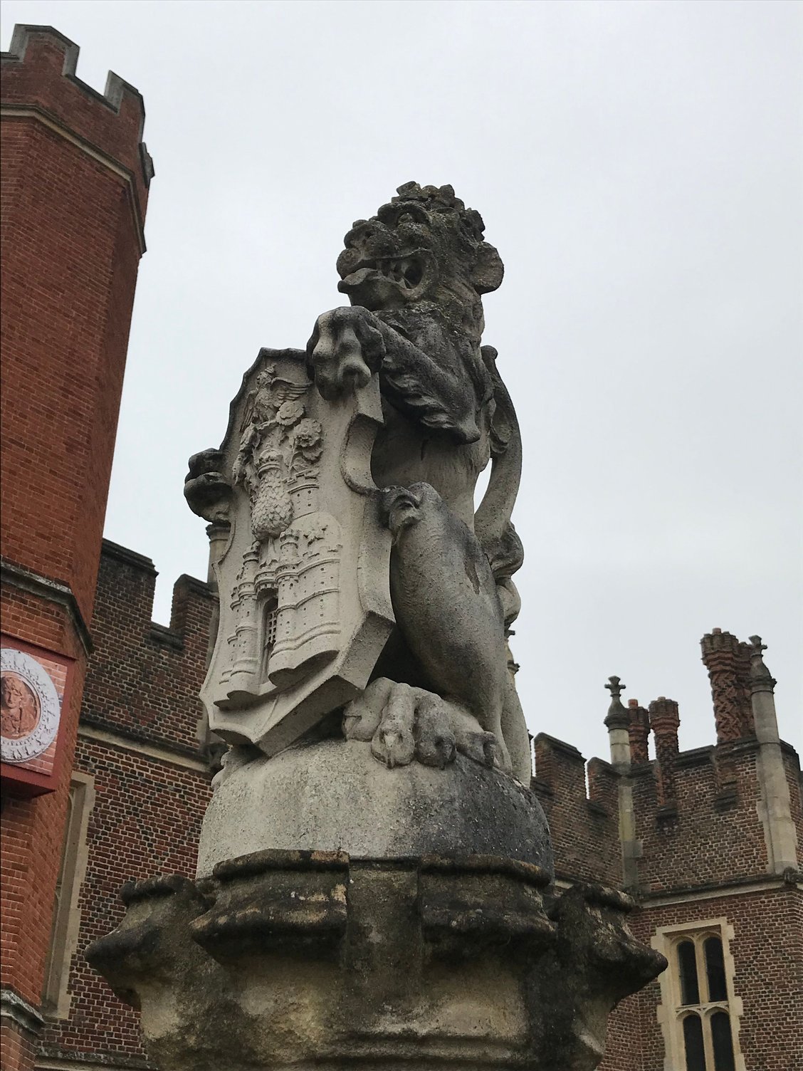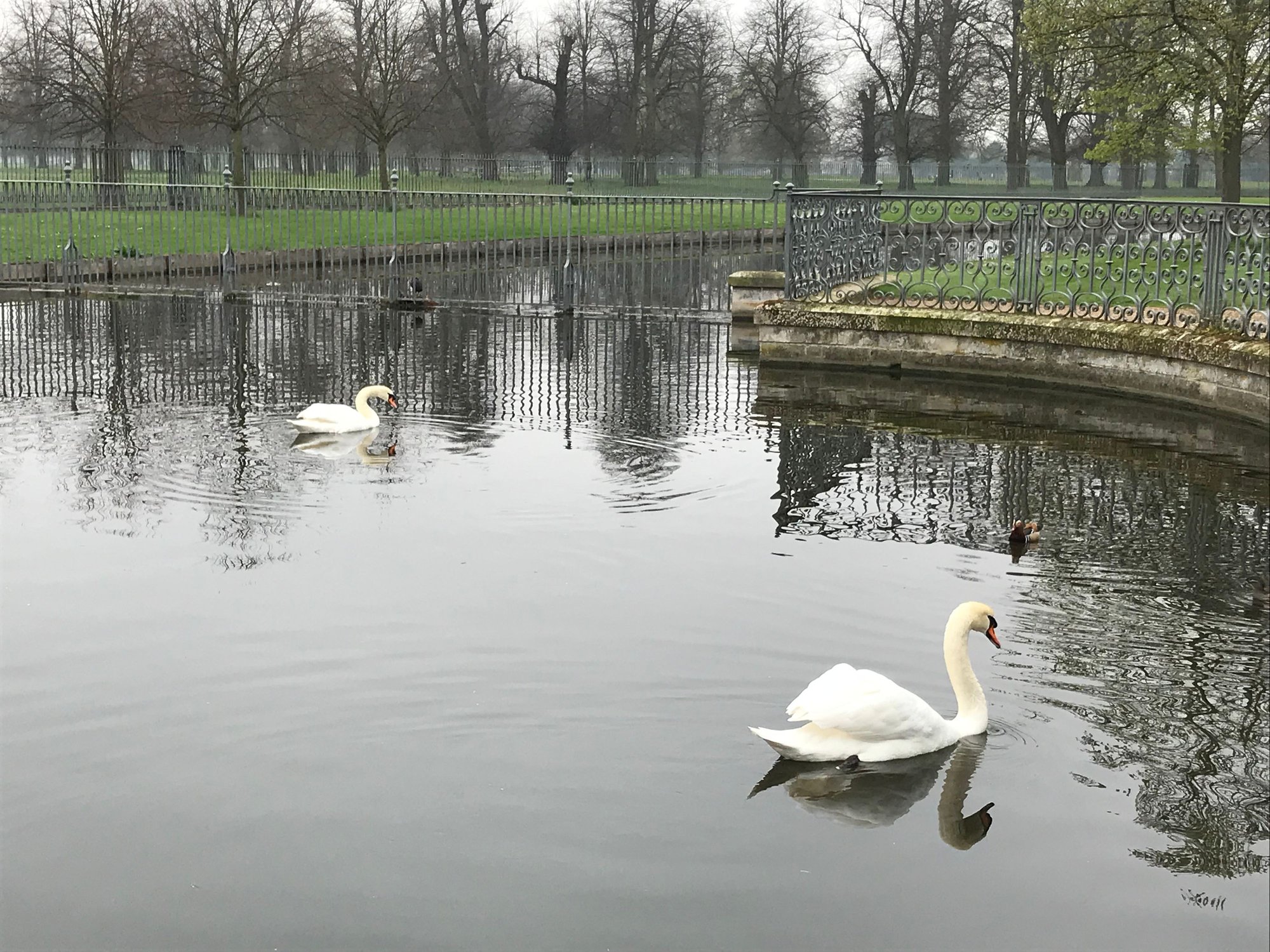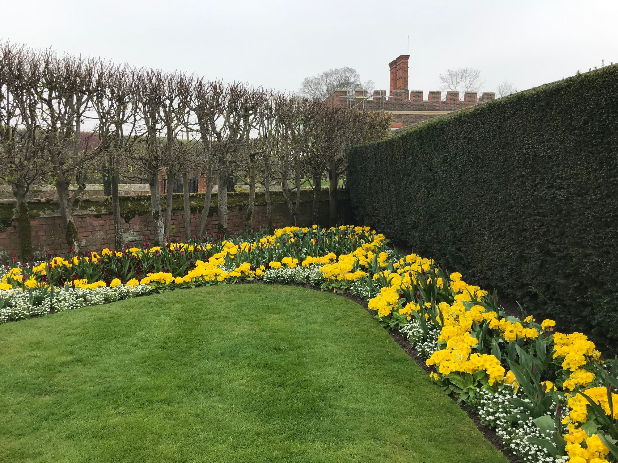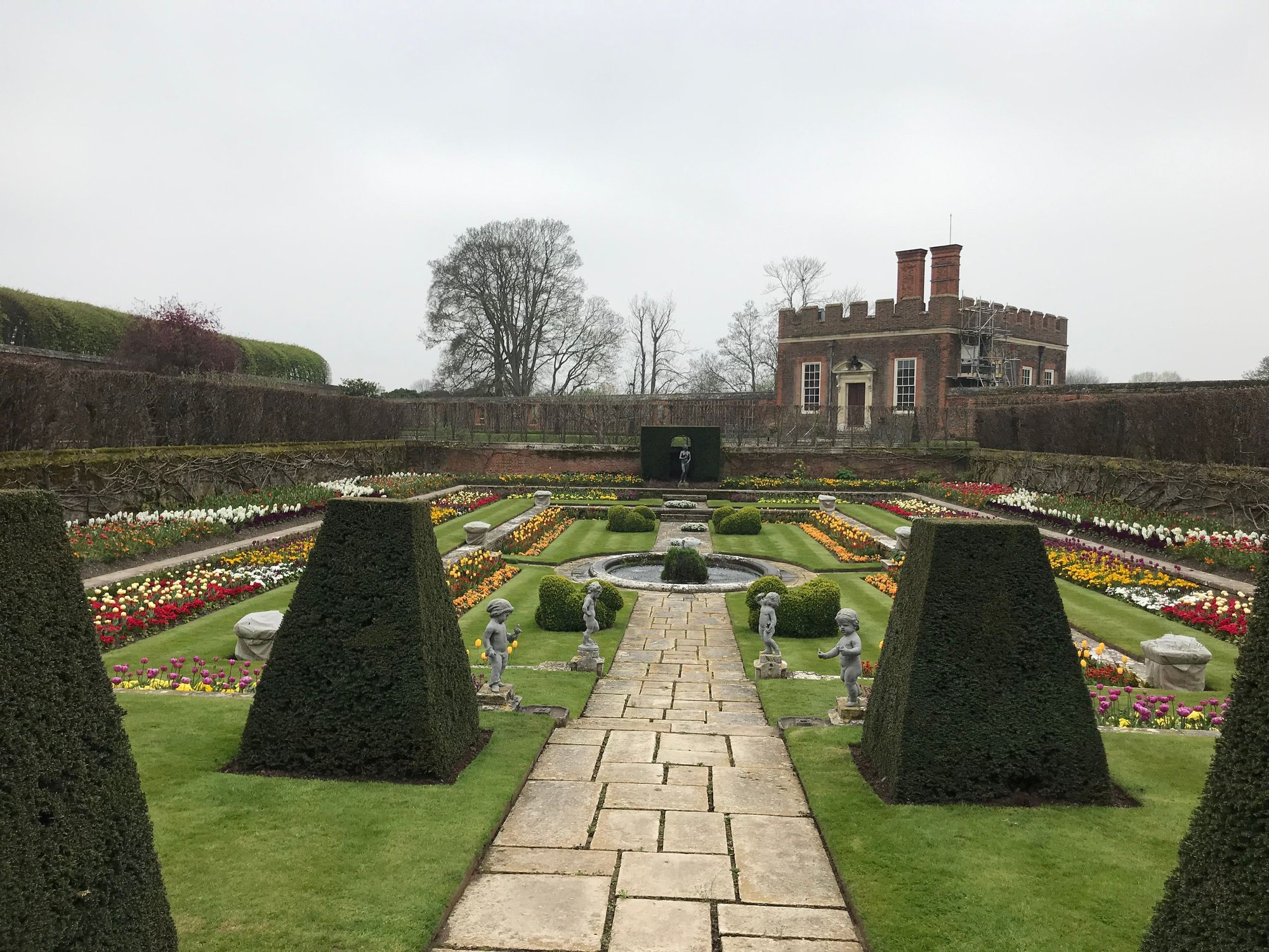 While the day wasn’t sunny, it didn’t rain and we were really able to enjoy the gardens and grounds at Hampton Court. Tons of tulips in bloom and a few late daffodils were still hanging on. Tons and tons of beautiful garden spaces. There was a huge area in along a wall that was covered with wisteria but not yet in bloom. (Our fence at the apartment was also covered with wisteria. I love wisteria and would love to see these vines in bloom). There is also a huge grapevine at Hampton Court Palace, as well. Ducks? Check. Swans? Check. Deer? Check. The property is massive and we didn’t cover it all but we spent 4 hours there. We ended at the maze which Chaz solved quickly and had to walk me through it. I blame that on hunger but we will never know. He will remind me of this event for the rest of our lives. Although, if there had been some jewelry or other treat at the end, I might have performed better!
