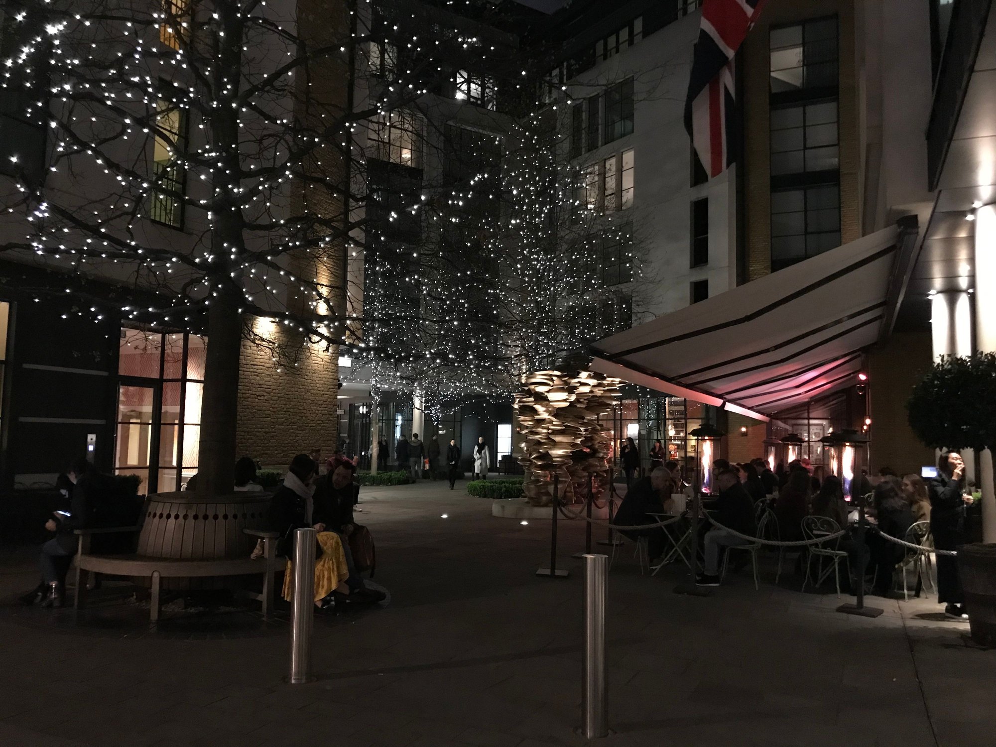 Our dinner reservation was at Ham Yard Bar and Restaurant that night. This place is part of a very chic and modern hotel but still warm. They also had outdoor space that was popular. Quite the scene on a Saturday night but we felt lucky to get a table for pre-dinner cocktails. I tried the Harvest Moon (red apple juice, winter fruit syrup, cardamom bitters and Applejack—like Fall in a glass). Chaz got the Ragtime Gal (Rye based cocktail). Both were excellent, so I got a second one at the table. Dinner was steak frites for him and sole meunière for me. Both were really tasty and the olive oil crushed potatoes that came with my fish were really good. We tried the cheesecake for dessert which wasn’t on the menu but recommended by the server. It was very light, fresh and nothing like NY Cheesecake. Great drinks and a great meal. We enjoyed Ham Yard a lot but it was time to call it a night.