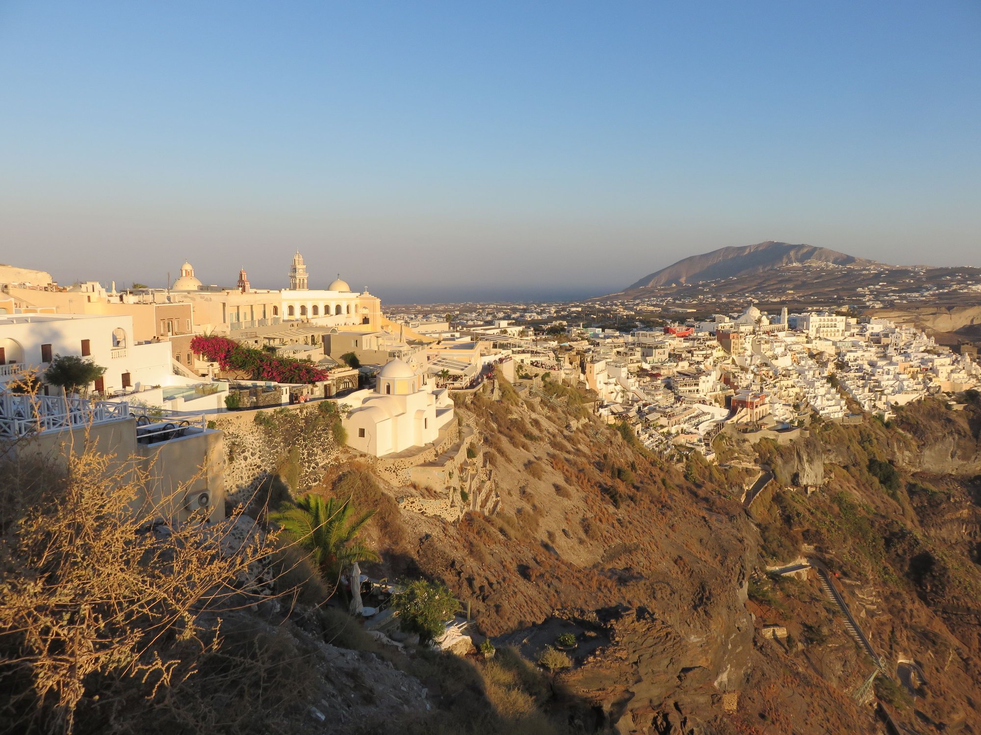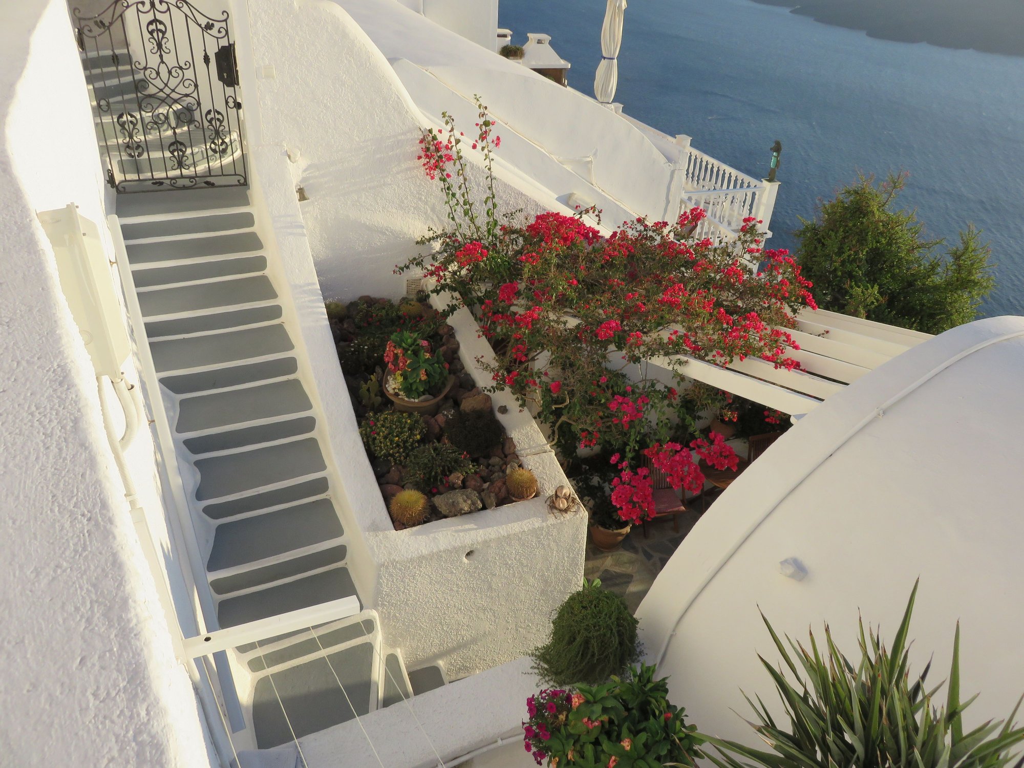 We stayed in Smaro Studios, overlooking the caldera. Clean, nice breakfast with fruit and yogurt, our own little patio and a tiny little kitchen area. Great for making coffee in the morning. We had to walk down several small flights of stairs from the main walkway through the village.