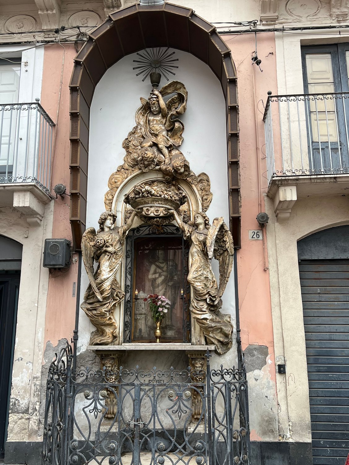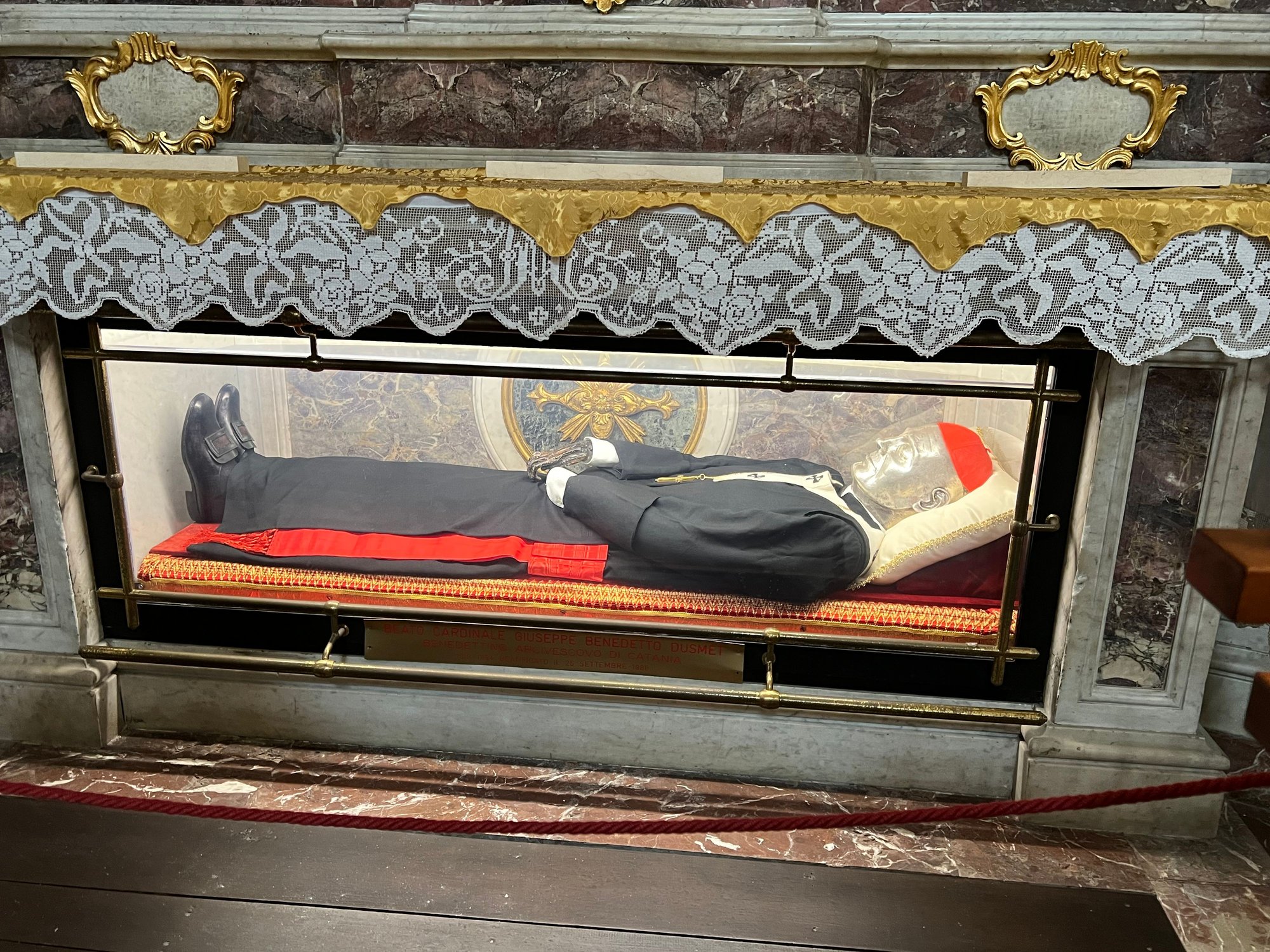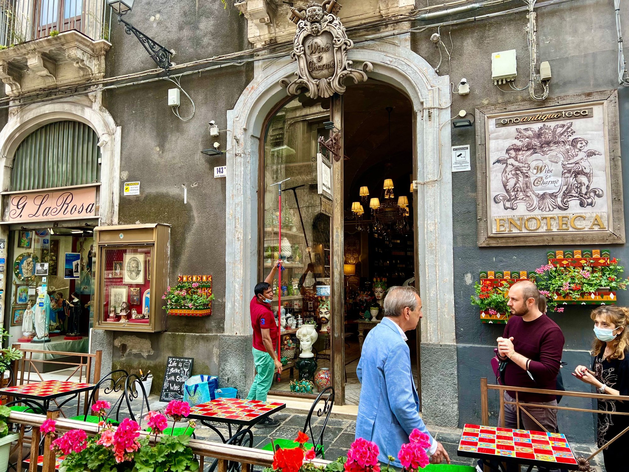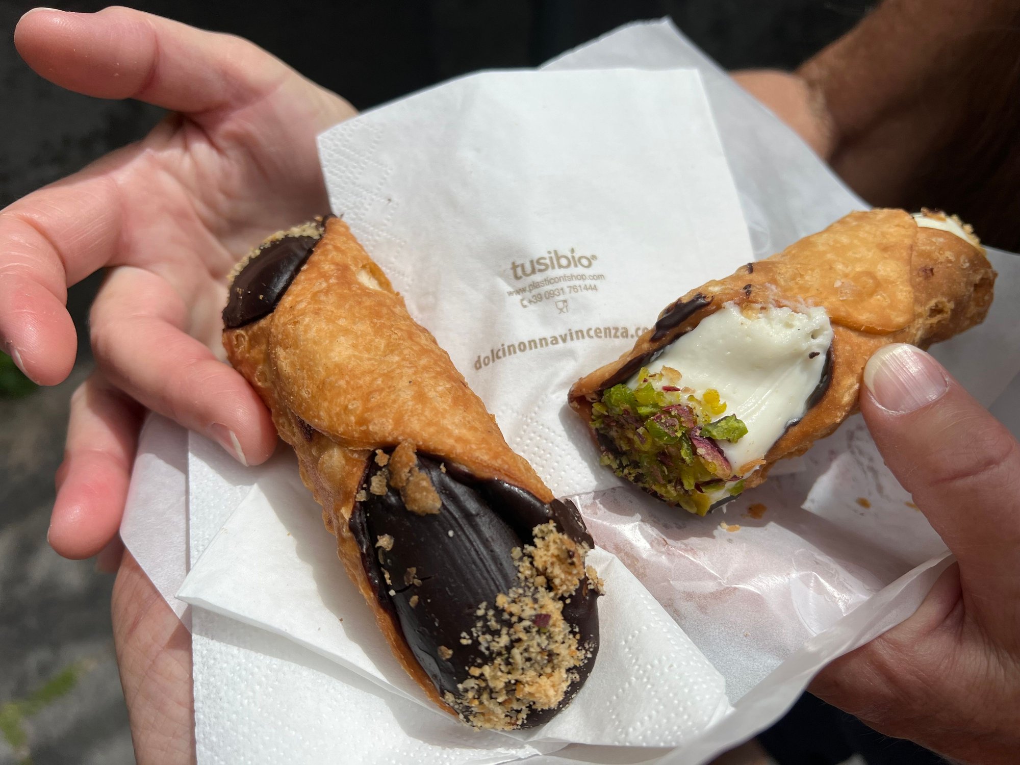 Although cannolo (singular) was first made in the mountains of Sicily, Catania is often considered its home. We make a pretty decent cannolo at home, using a simple recipe from my Dad whose father was born in the Sicilian mountains. One place that is often mentioned in the same breath as cannoli and Catania is the Nonna Vincenza pastry shop. Not old, but supposedly based on techniques and recipes from one of those mountain villages. It wasn’t easy to find, since its graffiti-marked exterior is unremarkable. Inside, however, it looked more like an elegant French pastry shop with chandelier. Our first disappointment was they don’t fill the cannolis to order, and that, for us, violates the cardinal rule that filling sitting in shells makes the shells soggy. We ordered one regular and one chocolate (partly out of curiosity and partly because we like chocolate). We were not allowed to eat inside as a Covid precaution. So, we found an unattractive stoop on a local street for our taste test. We were quite disappointed. We found this, and later a lot of Sicilian cannoli, to be firm, off-white, ultra sweet and heavy, and perhaps leaning toward a texture like frosting in a can (exaggerated). The chocolate was more like a rich chocolate mousse rather than a cannolo. But we preferred it.