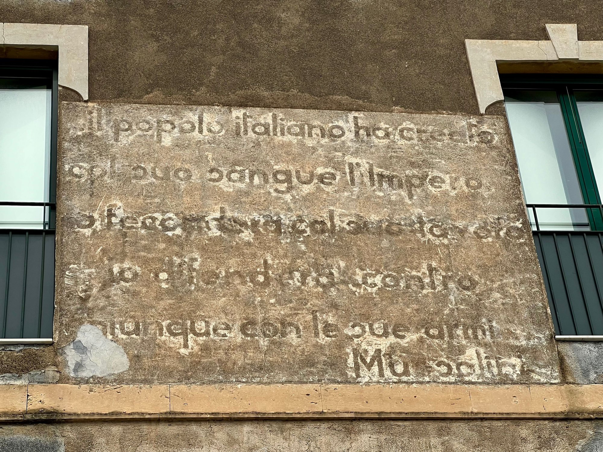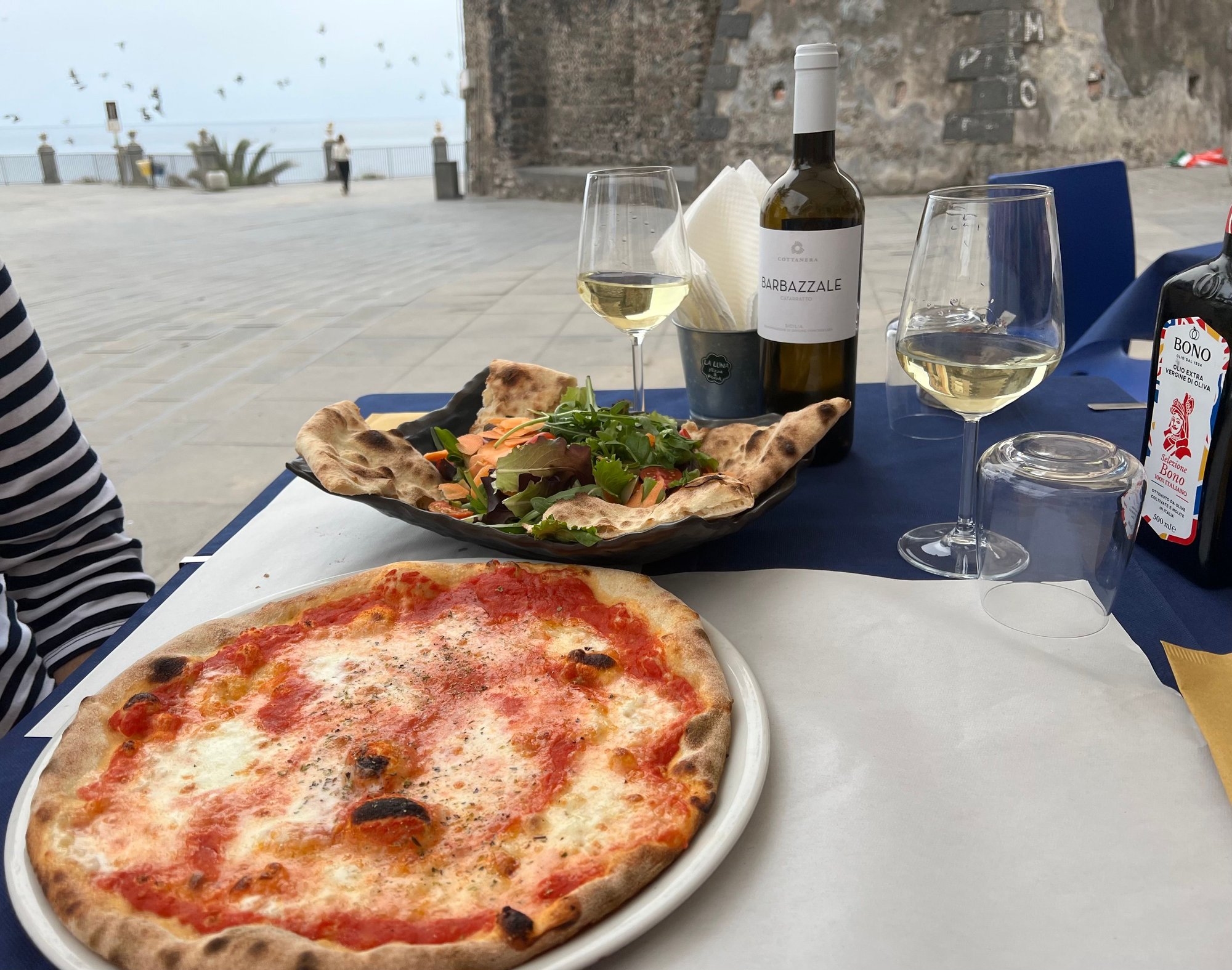 Today, there is a popular large promenade and square overlooking the sea with restaurants, all adjacent to the castle. One old building has a fading and presumably politically incorrect quote from Mussolini. Families were out and about. The promenade was a great spot for lunch.