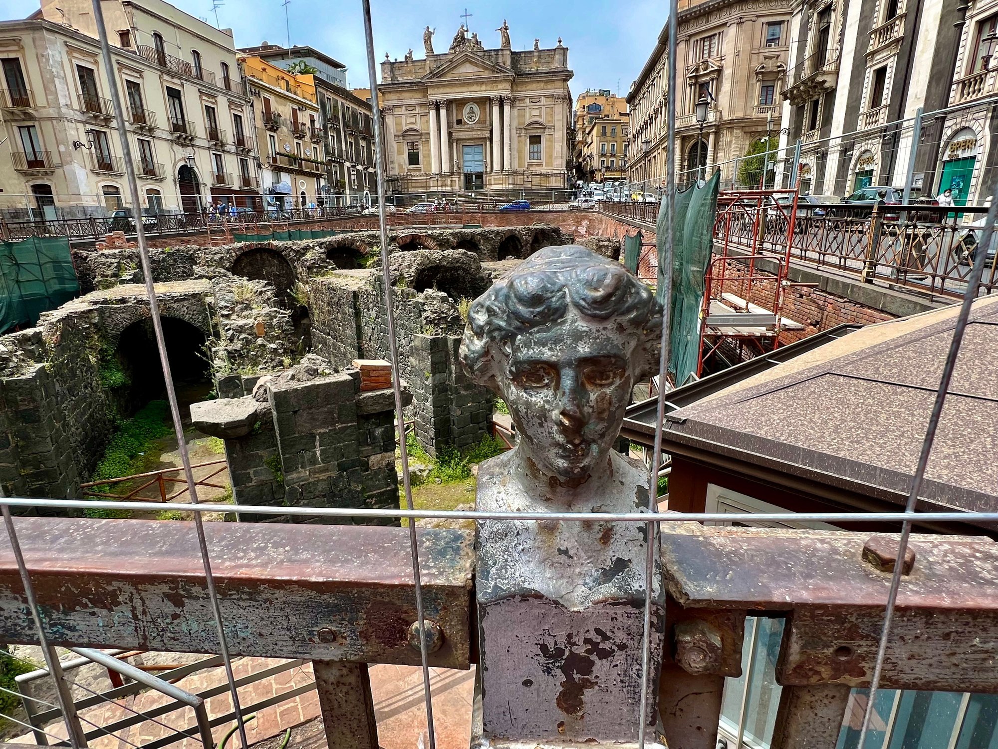 Via Etnea was not far from our parking spot. It is a long pedestrian street, running many blocks, the main shopping area downtown. In the middle of this commercial area were some of the ruins of what had been one of the largest amphitheaters in all of the Roman world. The ruins of this amphitheater date back to 300 BC, although expanded later. It could seat 15,000 spectators, maybe one-third of the one in Rome but significant nonetheless. After the 1693 earthquake, it was mostly covered by overlapping buildings constructed in the immediate area. It was unique in that it was constructed mostly of lava rock.
