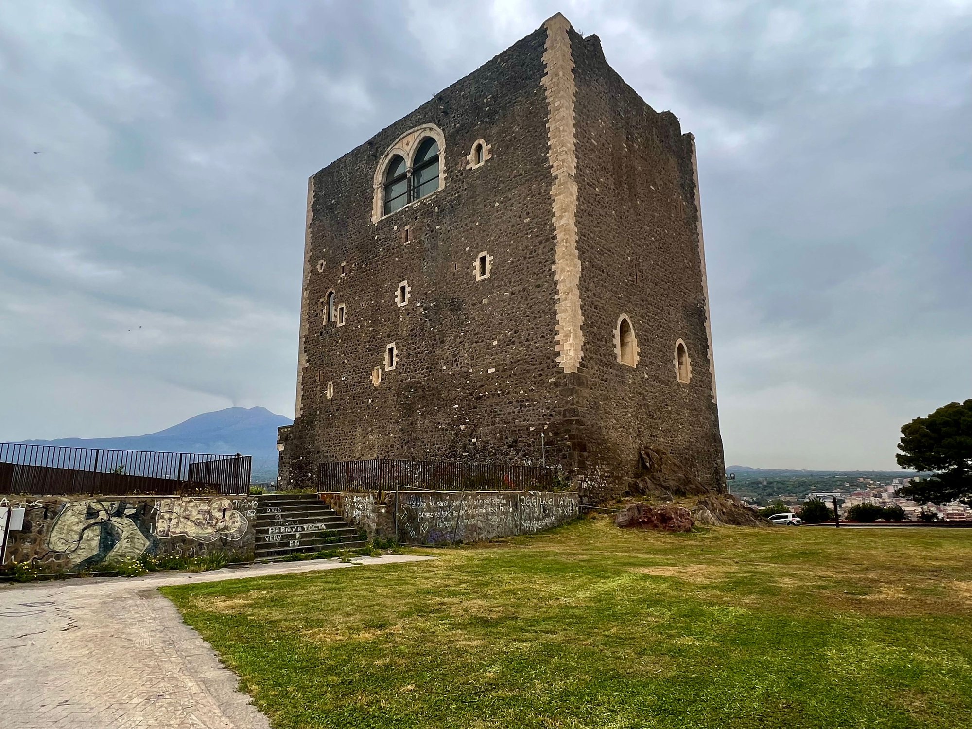 Paterno has 50,000 residents and another Norman castle, this one a tall rectangular box. I often jump at the first parking space I see when I come into an unfamiliar town. I would rather walk a bit more than end up in a ZTL zone or other corner that is difficult to get out of. So, instead of parking next to the castle, as we learned later that we could have, we had a steep hike up a long set of stairs. The castle was open, without a fee, and it was in great shape, with sweeping views over the countryside on one side and the city below and Mt. Etna on the other side.